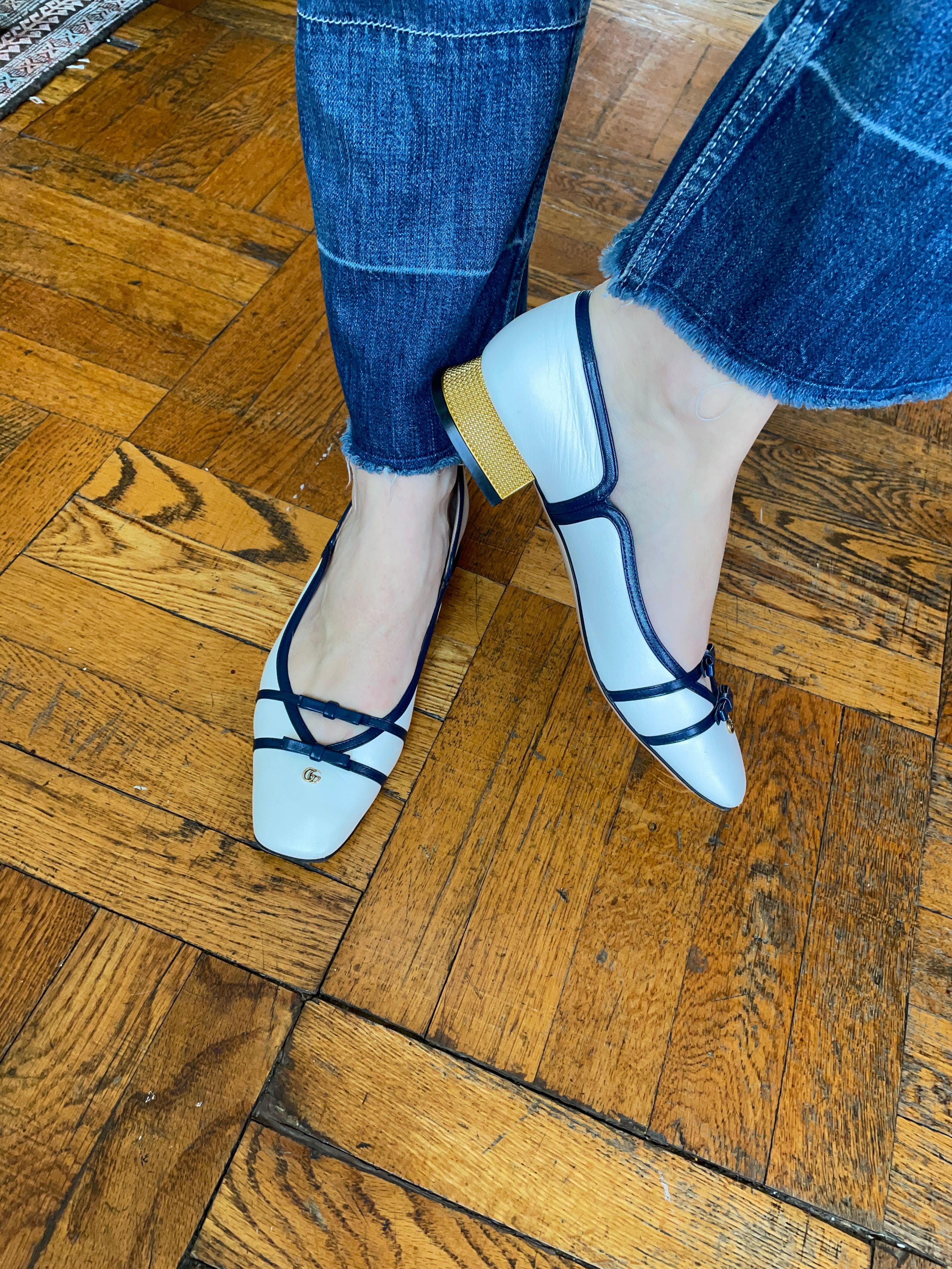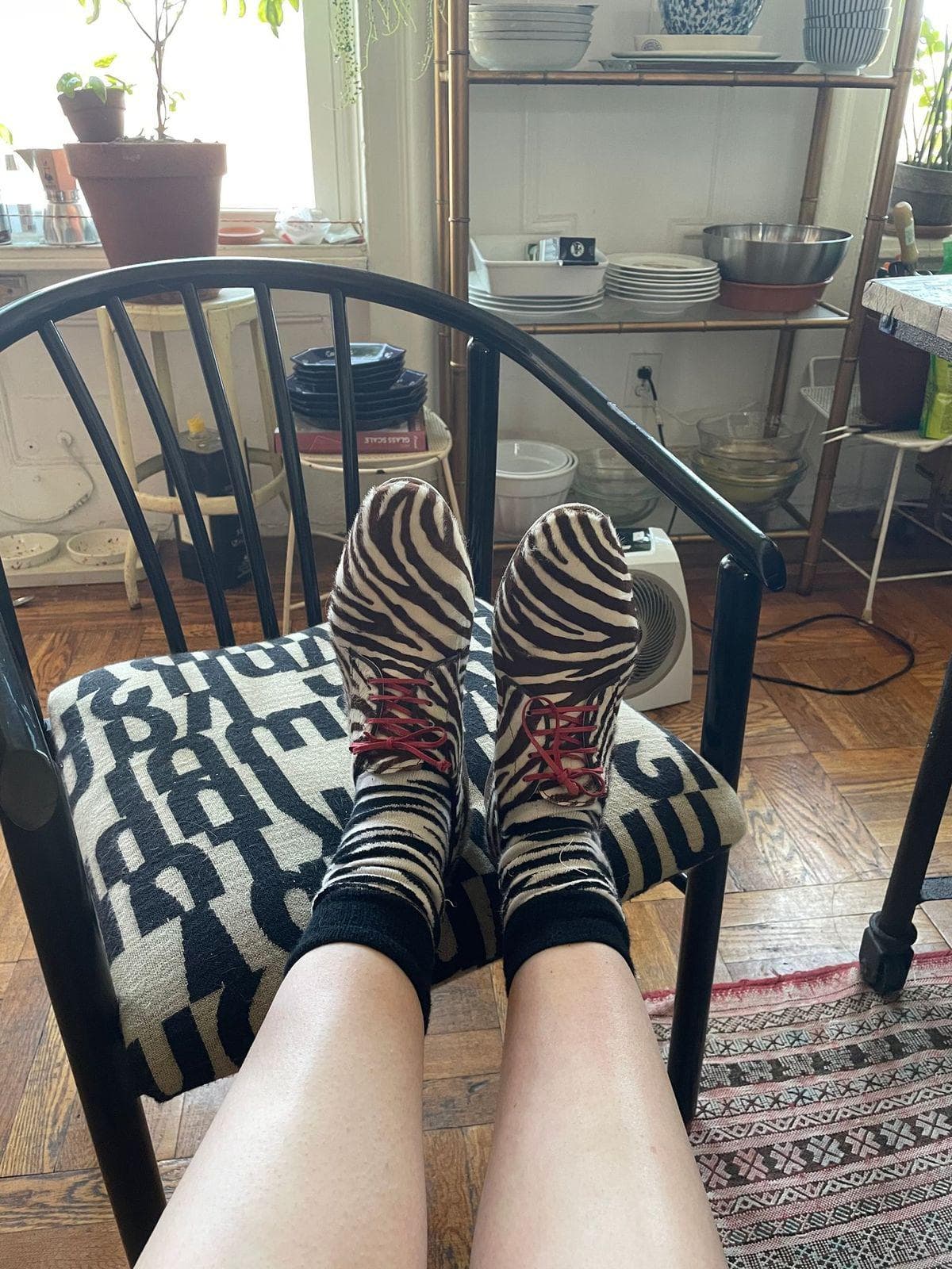Photo: Courtesy of Angelica Hicks"This is a foray into wearing a coat with socks. I've always wanted to do it, but I normally wear tights. Tights would not work with this look, so it challenged me to do just that. This is a very loud composition which I like—loud, but also matchy-matchy and topped off with my favorite neutral coat. I love the sweater skirt set, and I thought, 'Why not pair it with a sock-shoe set?' It made me smile."