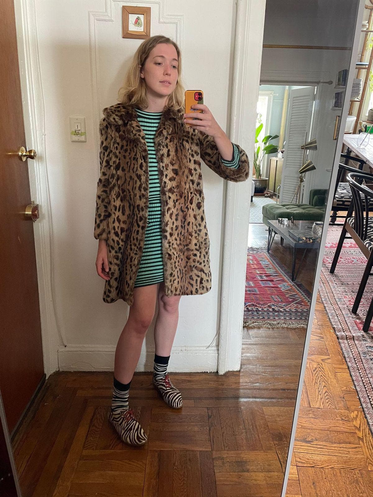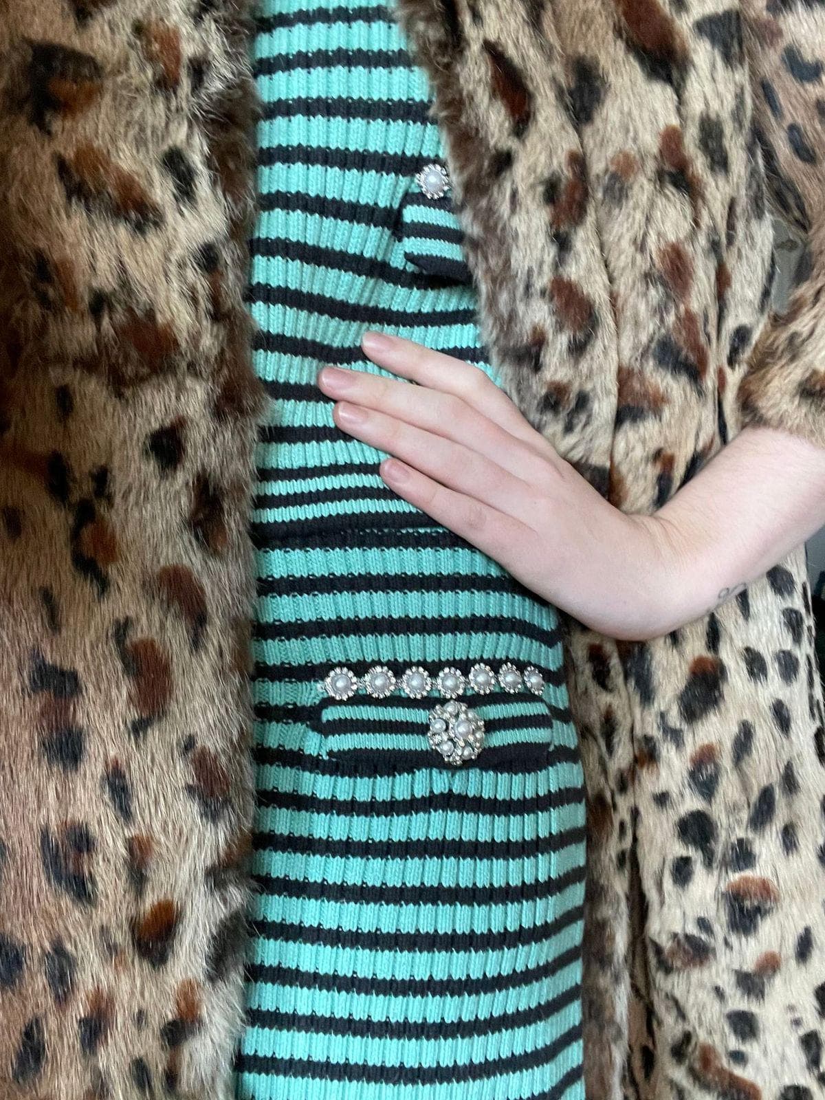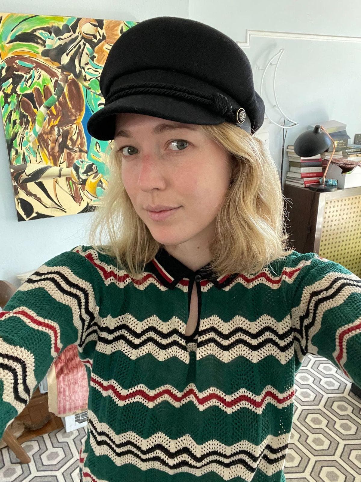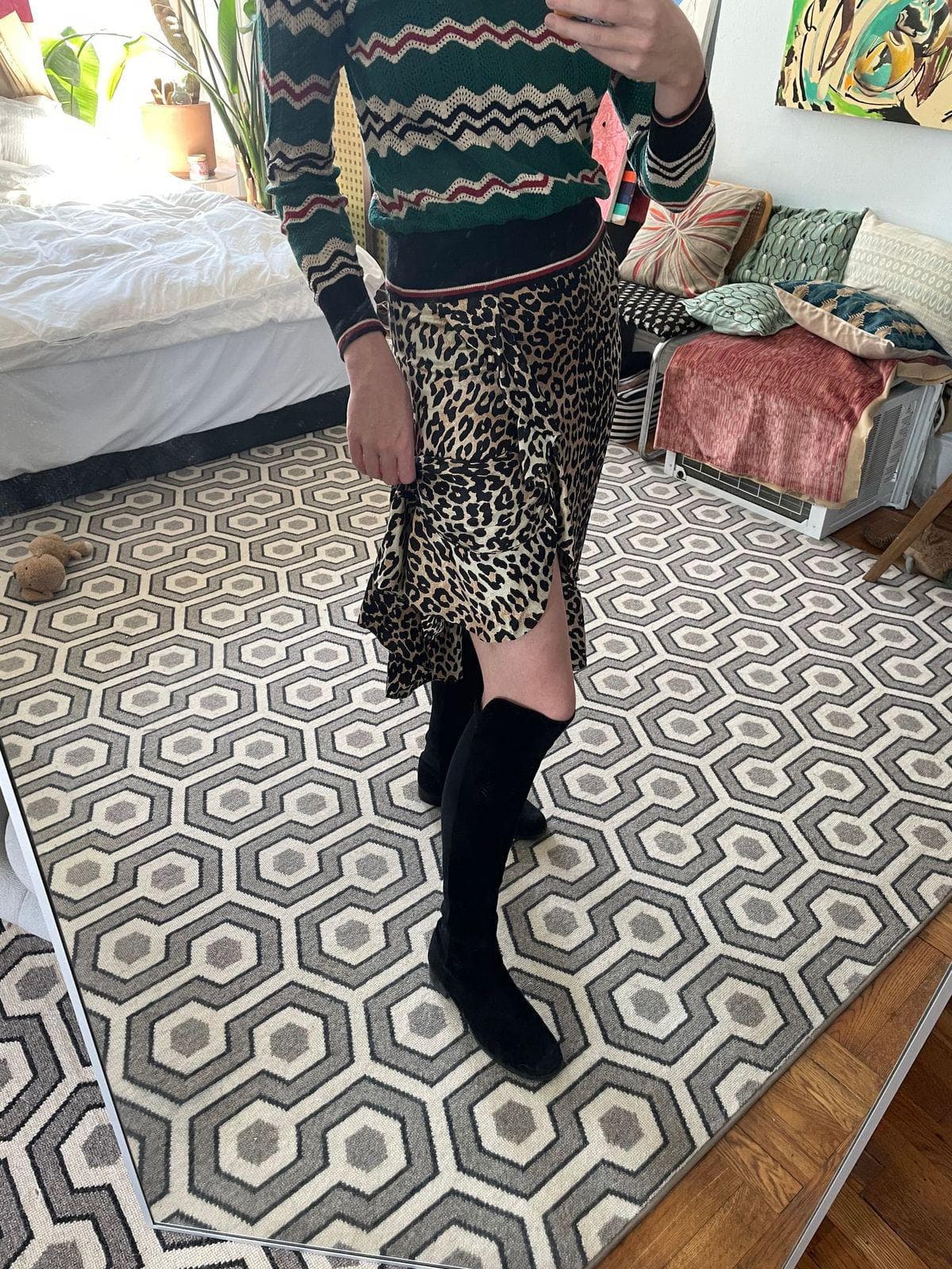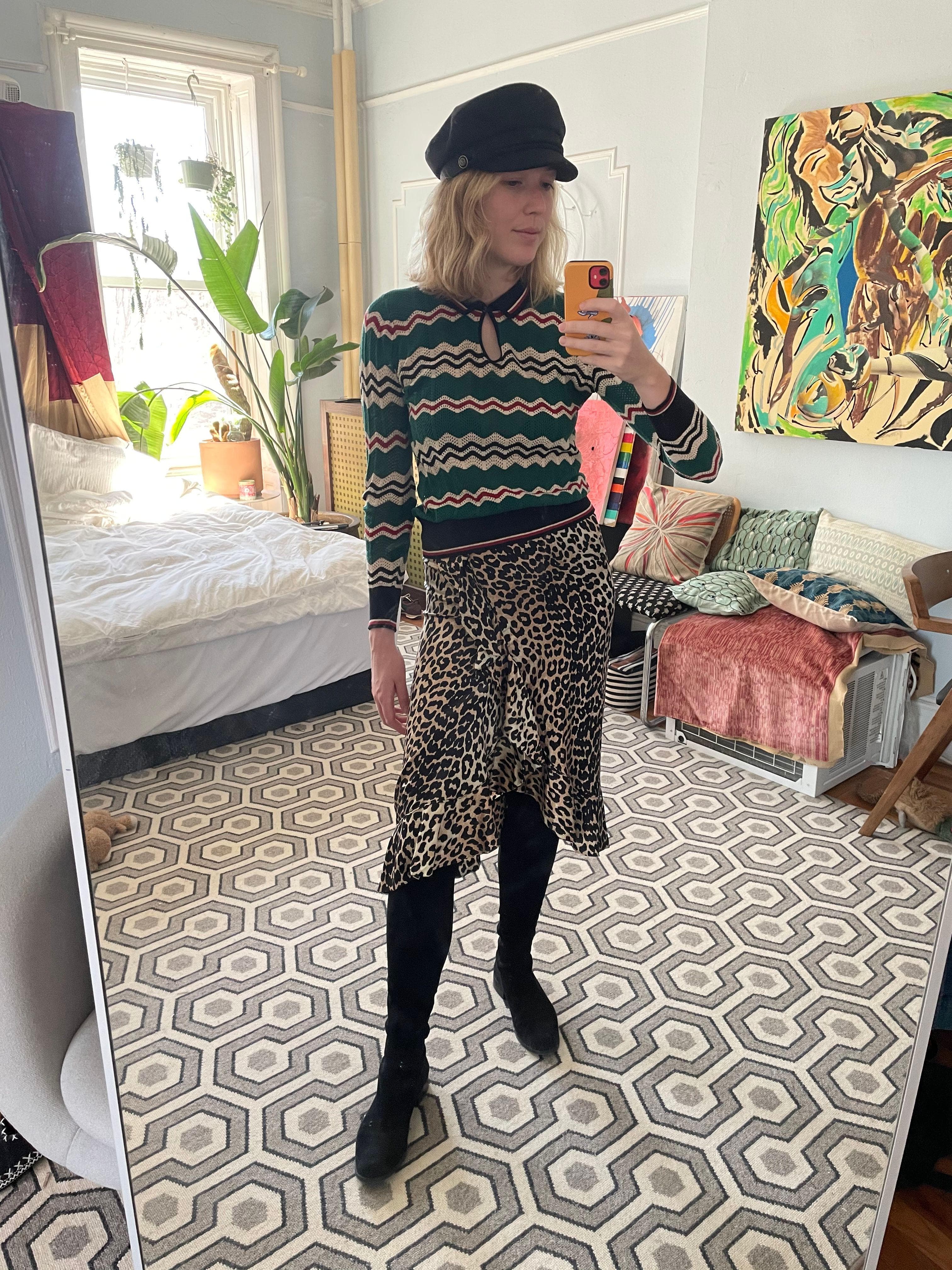 Photo: Courtesy of Angelica Hicks"My mum gave me this hat for Christmas, and I feel like it completes the look better than a jacket would. I like the symmetry of the plain black hat and plain black boots which tie the colorful sweater and skirt together nicely. Tired but true, leopard is a fantastic, vibrant neutral. The sweater was also a gift (from my sister for my birthday), so this outfit is, I suppose, the gift that keeps on giving. The boots I have had since I was about 17—they were my first big purchase. I was always quite tall, so I used to wear them with horrendous knock-off Herve Leger dresses to go 'clubbing' in London. I kept them all this time and find it quite funny how differently I wear them now."