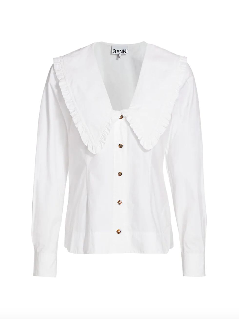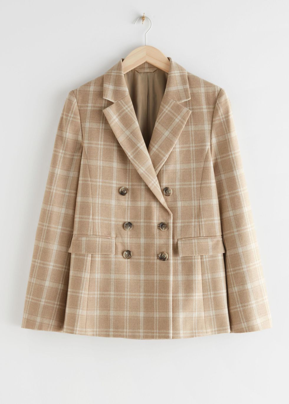 "This is a very simple outfit that basically works to show off the shirt. The shirt is made by the very talented sustainable artisanal couturier graduate from Central Saint Martin's, Larissa Von Planta. Everything she makes is 100 percent upcycled, and this shirt is made from old Austrian curtains! I love the cinching at the waist and the asymmetric sleeves—I love the fact that one is long. I like to wear it under this coat because it shows off the cuffs. The coat is also the perfect comfortable spring coat. I'm a big fan of the wool gingham as it makes the print appear blurred. It's a simple look that makes me feel good."