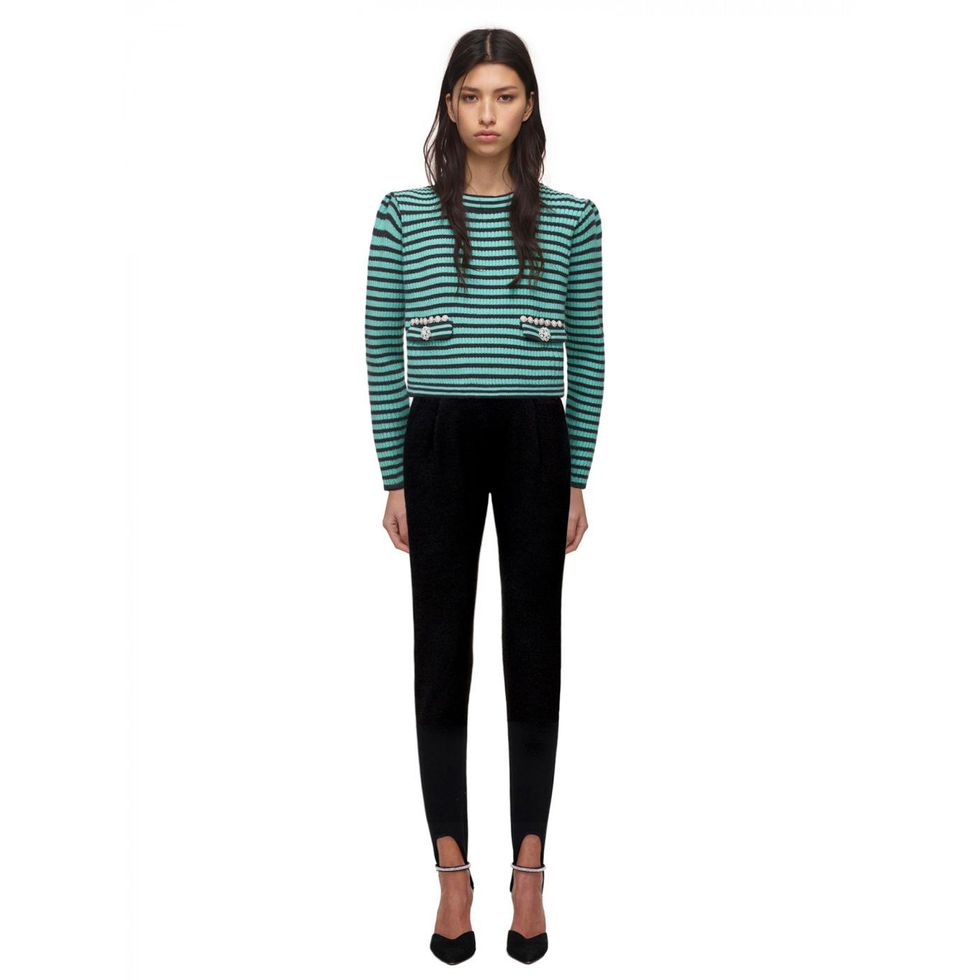 "This is a foray into wearing a coat with socks. I've always wanted to do it, but I normally wear tights. Tights would not work with this look, so it challenged me to do just that. This is a very loud composition which I like—loud, but also matchy-matchy and topped off with my favorite neutral coat. I love the sweater skirt set, and I thought, 'Why not pair it with a sock-shoe set?' It made me smile."