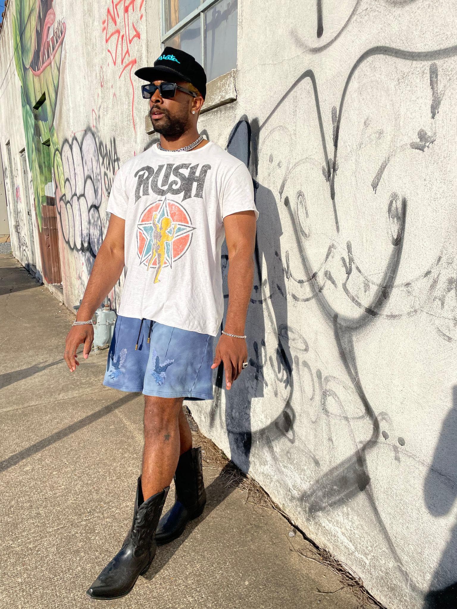 AE: "This is a look I've worn similarly before. Very throw-on, very get-what-you-see, very I-don't-give-a-fuck. I threw the cowboy boots on as an irregular decision. I love when I can keep an element of surprise in my 'fittys. Every day we took pictures when the sun was out, and I have a love/frustrated relationship with sunglasses. I love what they do for me stylewise and I have a face/head shaped for them, but I'm also a naturist, so I enjoy seeing how the sunlight is blessing the planet with my bare eyes.