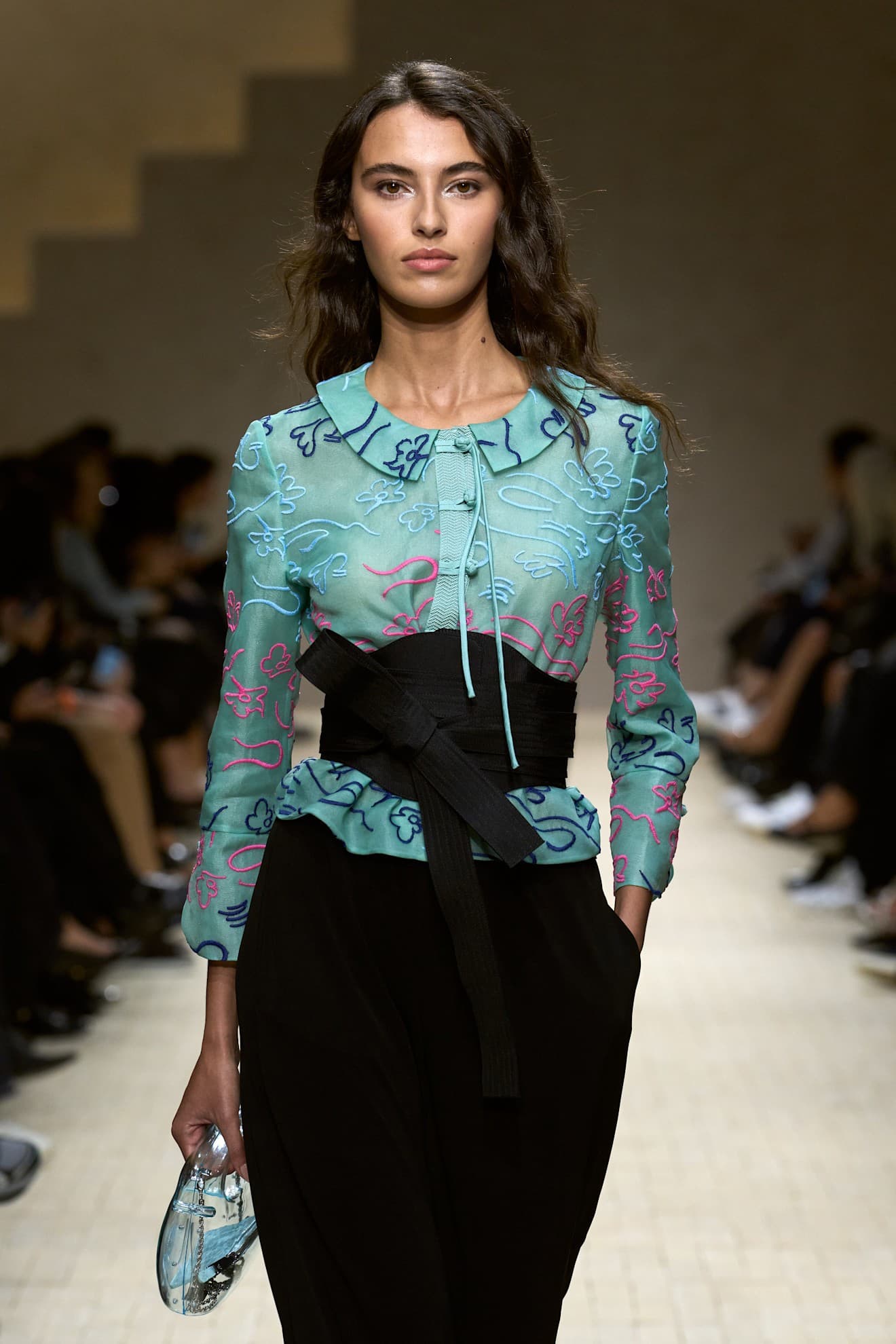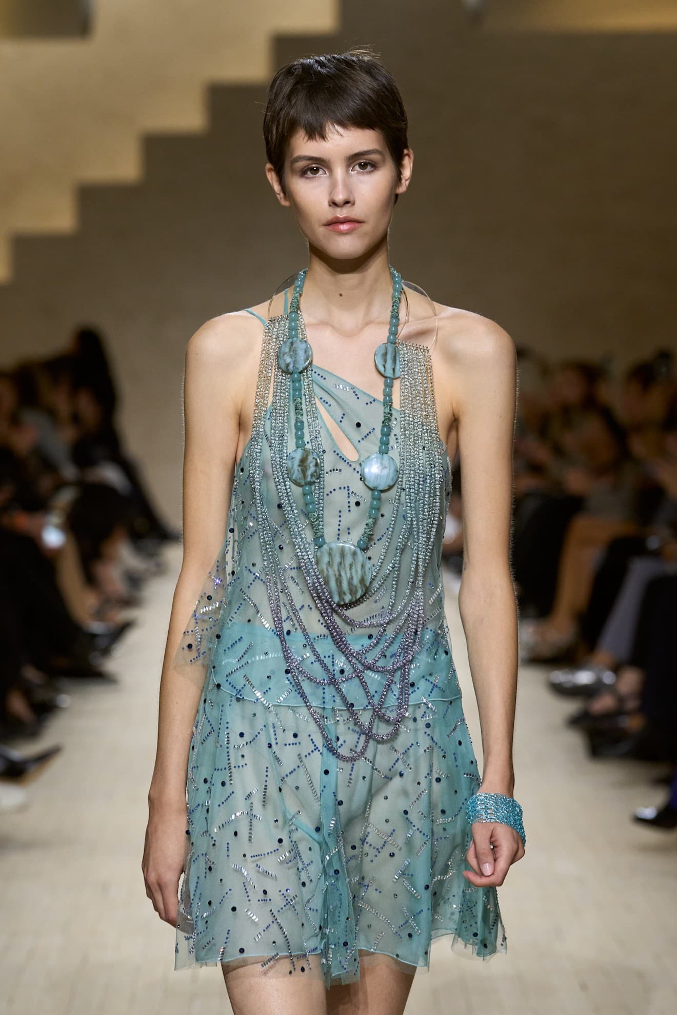 Prada Spring/Summer 2026 LaunchmetricsI took Emporio Armani's Spring/Summer 2026 collection as a full on aquamarine endorsement. Aquamarine blouses featured squiggled embroideries of different colors, sheer netted aquamarine sequin pants made a strong case for statement pants in general, and matching skirt and top in a muted aquamarine featured embroidered beads and was accessorized with layers of beaded necklace, one which featured aquamarine beads and stones. How much closer to a co-sign can we get?