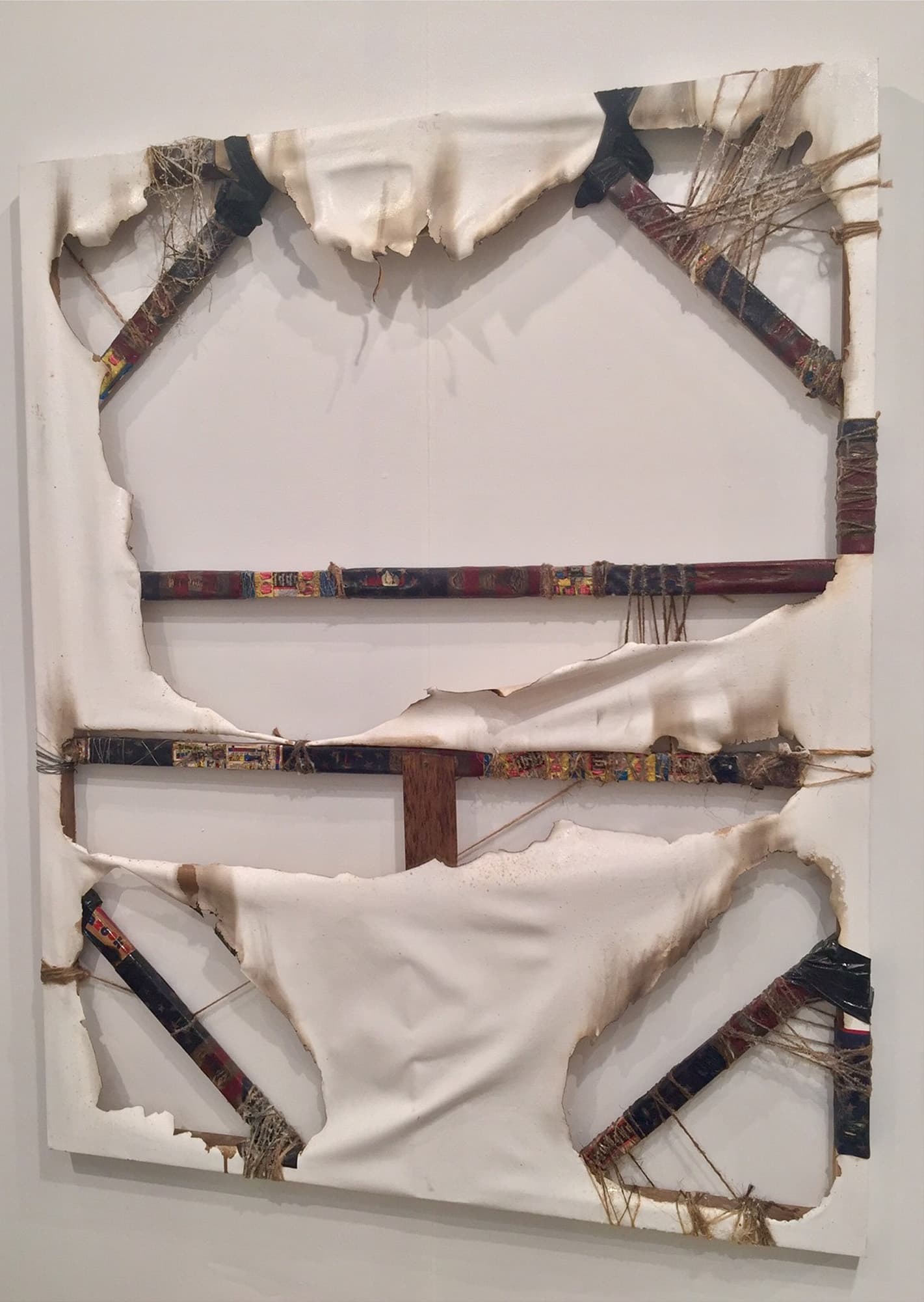 “Artist and dear friend Bernie Taupin, this is one of his gorgeous assemblage works. He takes a blowtorch to the canvas. Rough burlap and twine wraps the scorched edges, incredible bits of bazooka wrappers and collage flank the stretcher bars. It’s intricate and complex—this one reminds me how love reshapes us. We’re never the same again.”