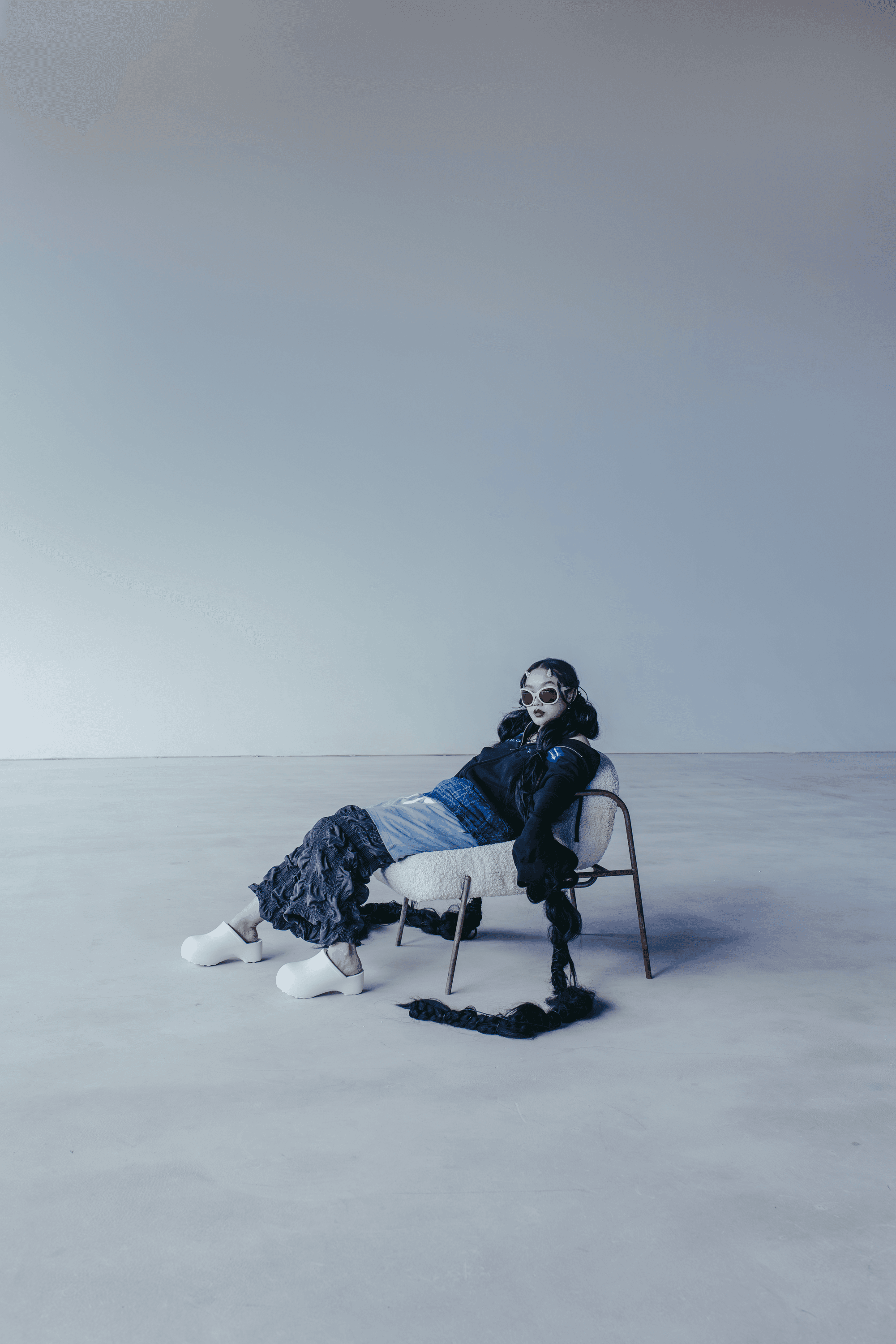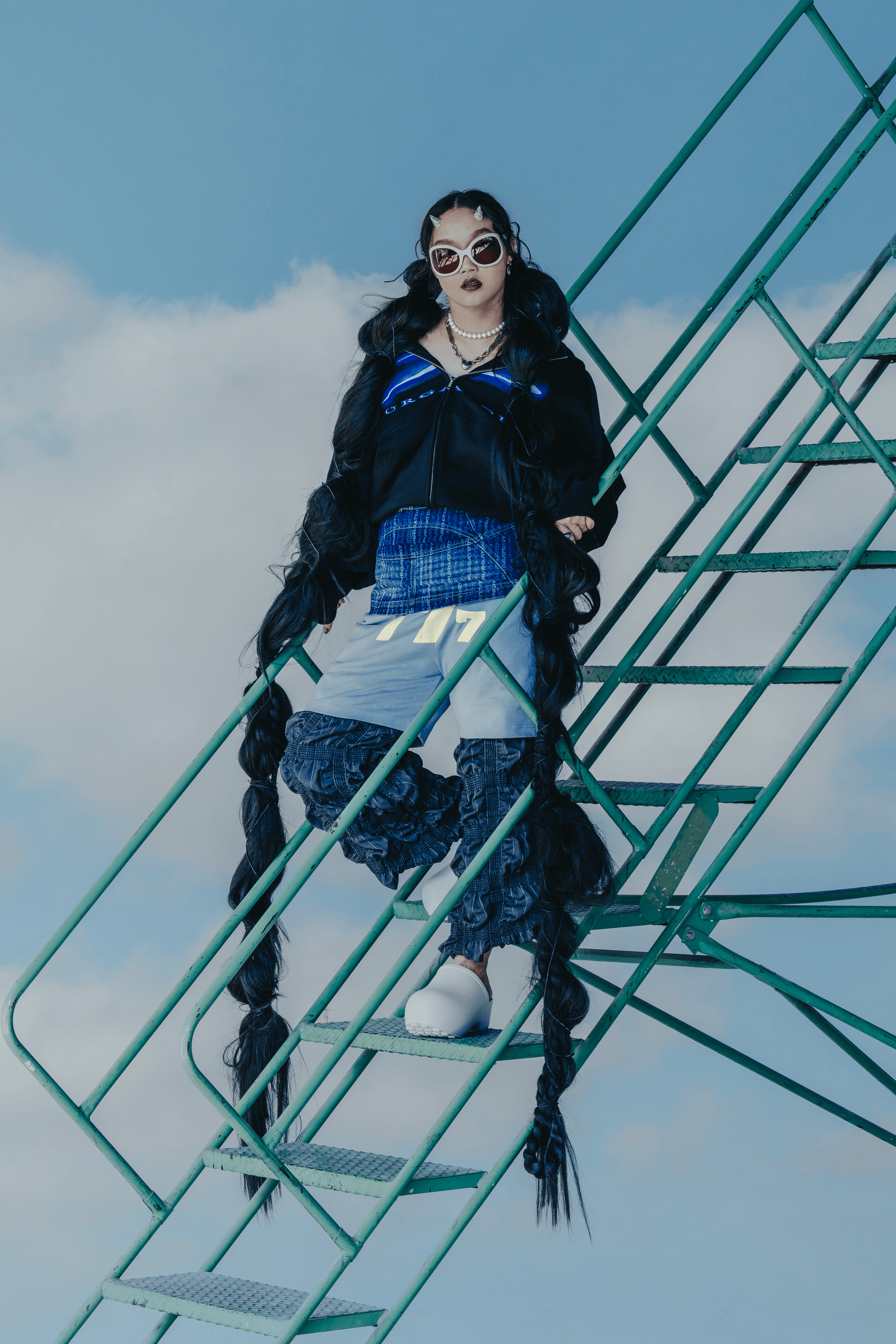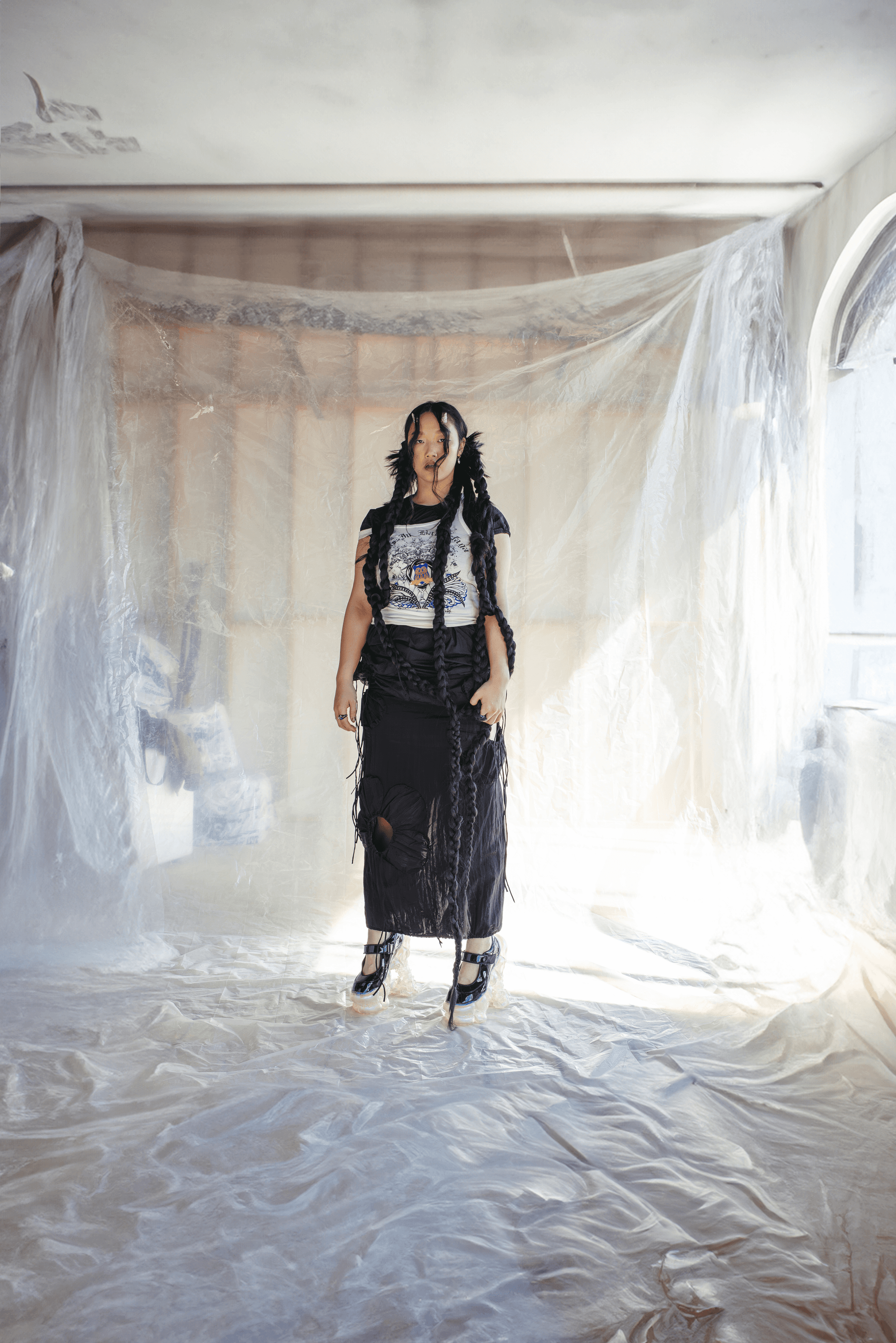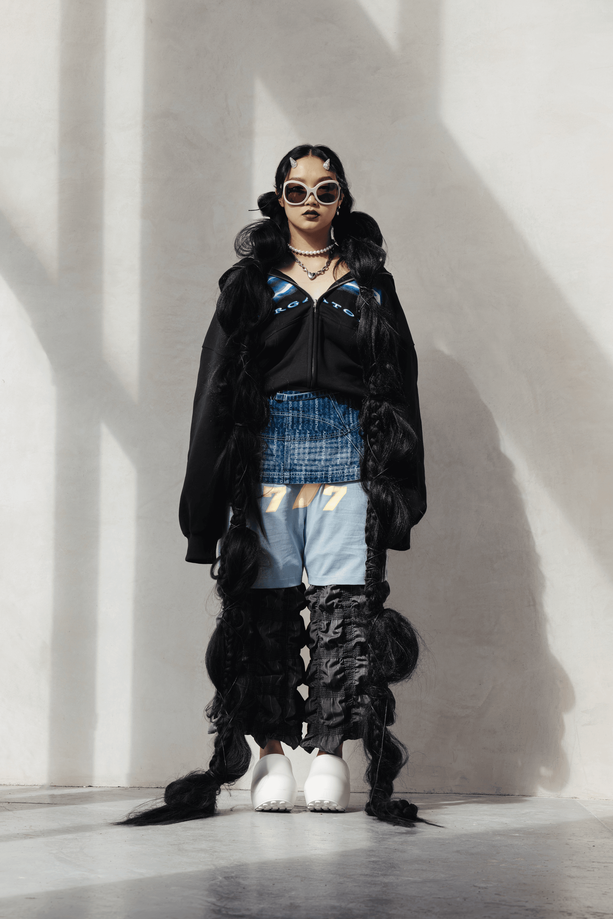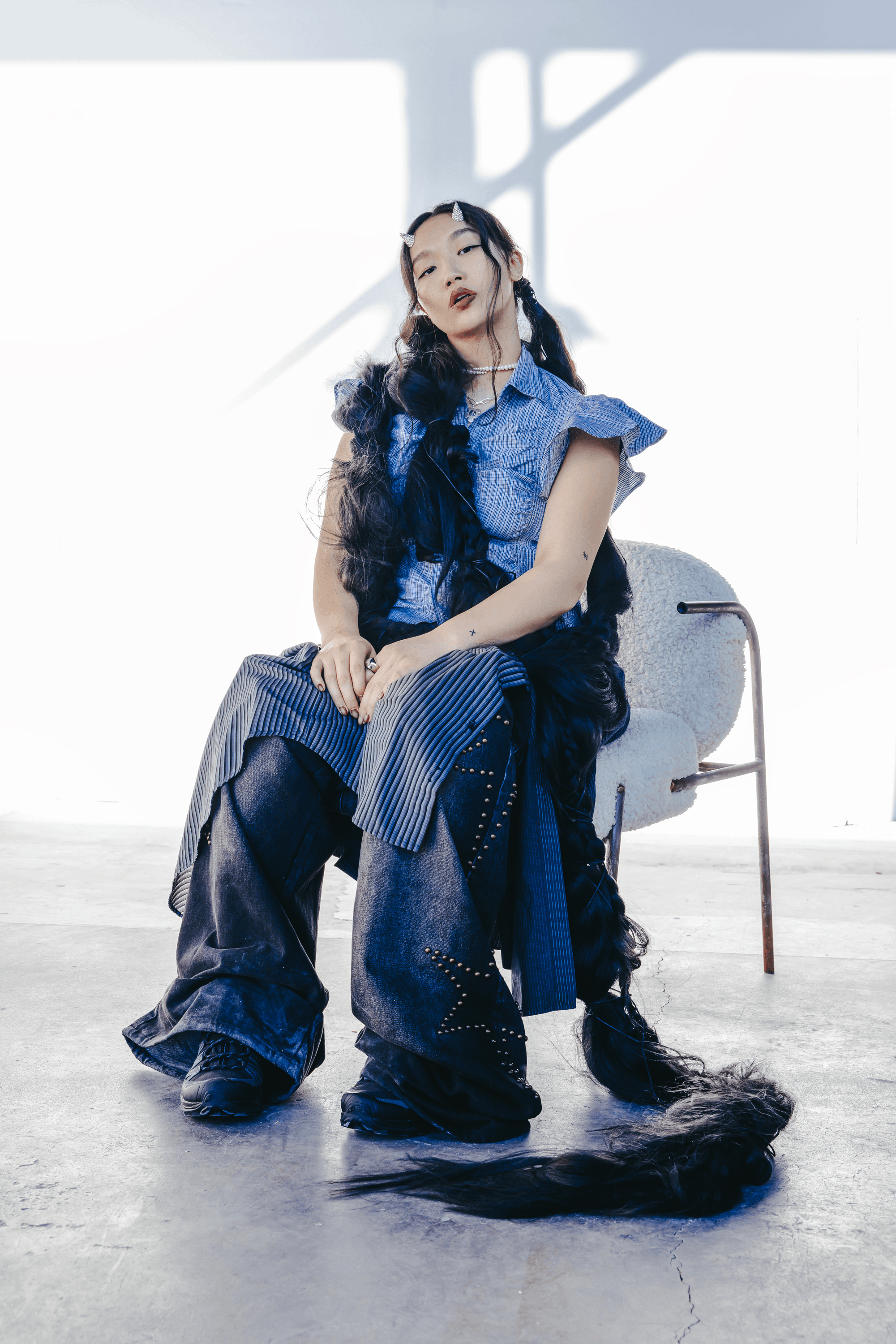 Stepping on Audrey Nuna’s photoshoot set, the studio has an atypical calm as the glam team and stylists assemble the first look of the day. Nuna seems to have this effect on people—a warm and unhurried composure that sets the emotional temperature of the room. Walking into the backstage prep area, I see Nuna in the makeup chair, piles of hair extensions to her left, as her mother hand-plaits more hair into a braid that is already six feet long. The gesture of a mother braiding her child’s hair evokes the nostalgia of getting ready for school, but—like most of Nuna’s creative output—there is an element of surreality that accompanies all sentiment.