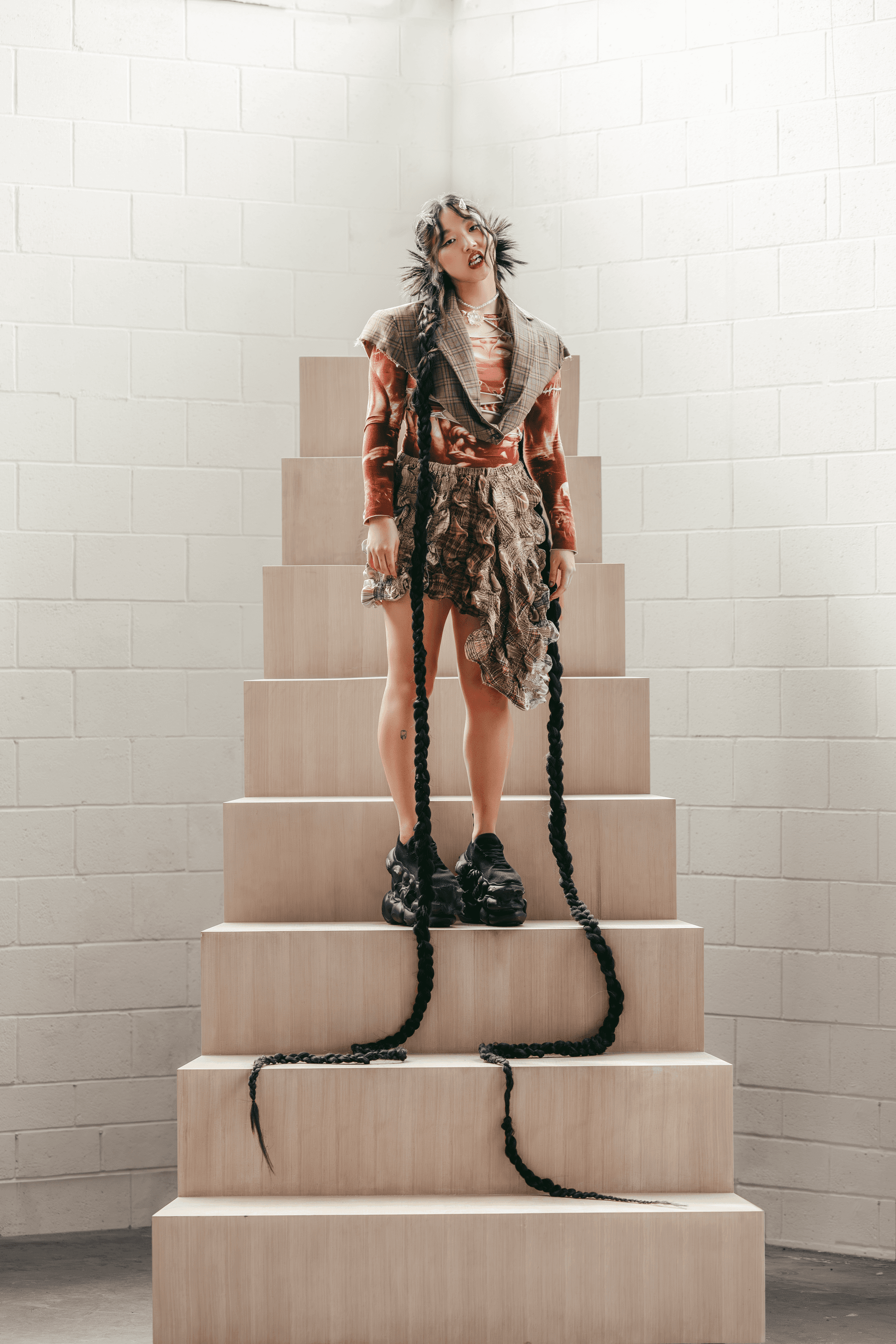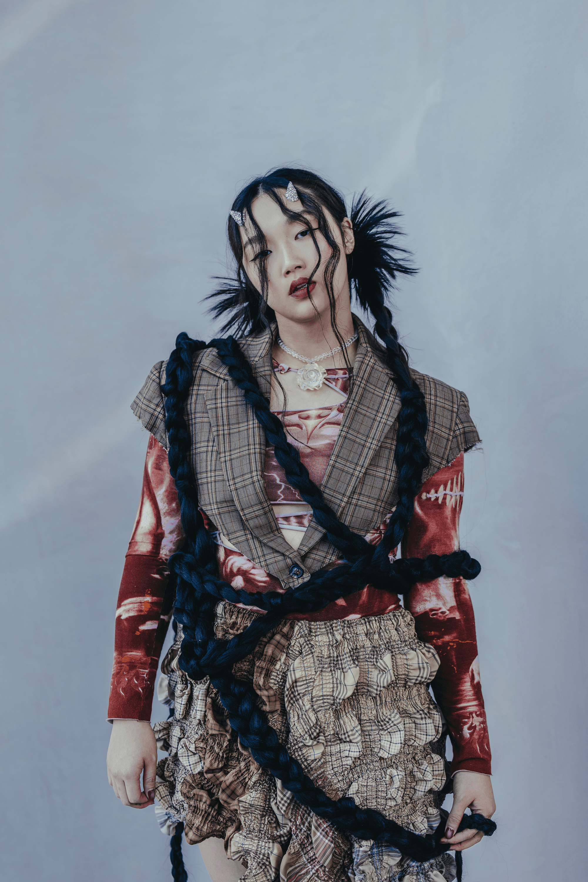 Top: Mortica; Skirt: Banzo; Pants: Purgatory; Shoes: Salomon; Choker: Ayana Designs; Necklace: Ayana Designs; Ring: Rare RomanceWhat is the concept behind the braids?