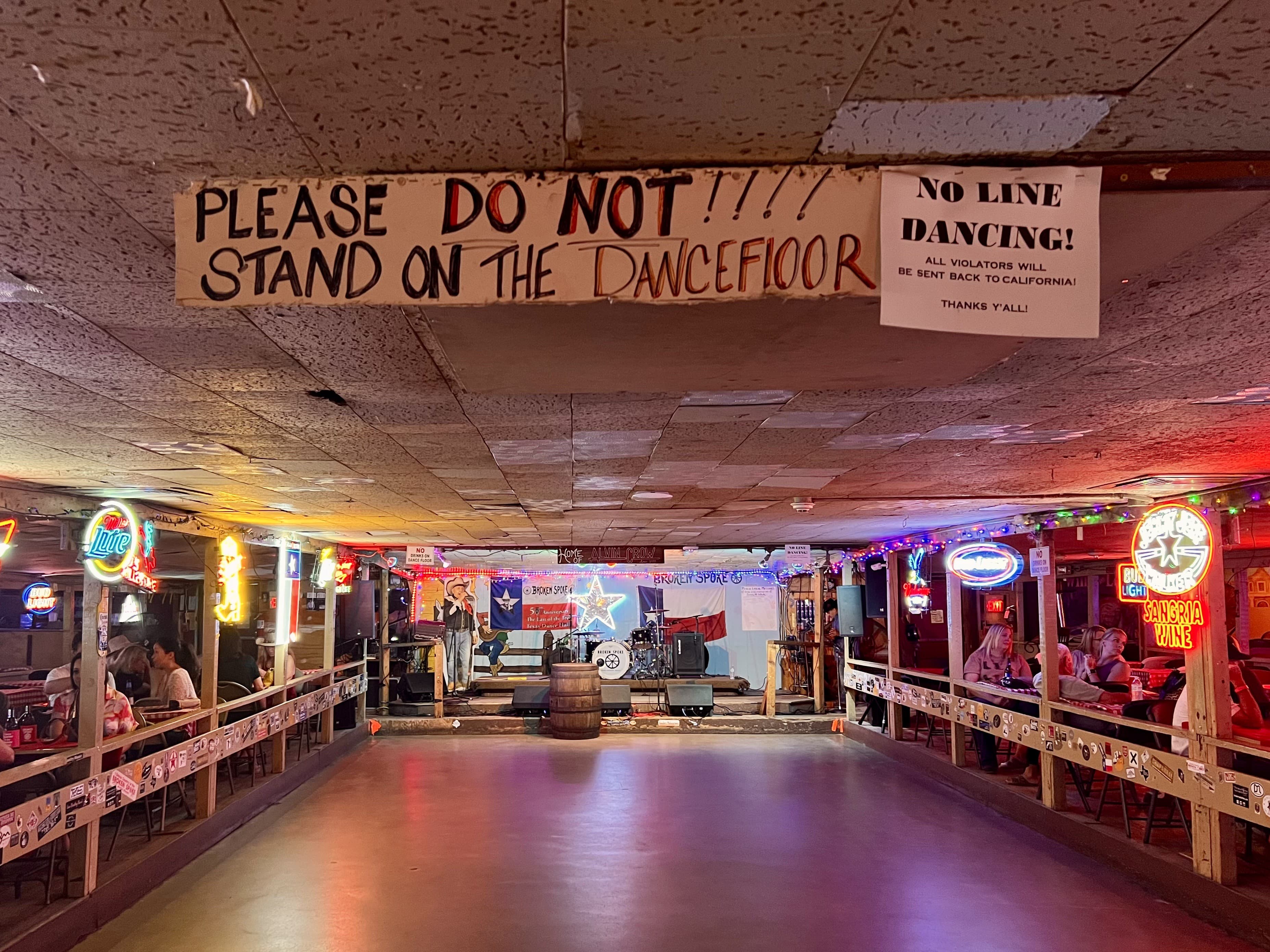 That night we met up with another friend to go dancing. I had recently written a piece on line dancing and fondly remembered my “Cotton-Eyed Joe” phase in 8th grade, so I was eager to try it. When we got to the famous Broken Spoke Dancehall, the person checking my ID noted that I was from California and made jokes about going back to where I came from. I’d heard a few of those on the trip so far and laughed along at first, but he soon launched into an oddly aggressive rant about his hatred for Californians and their mass conspiracy to “change things.” Once safely on the dancefloor, I saw a sign proclaiming, “NO LINE DANCING! ALL VIOLATORS WILL BE SENT BACK TO CALIFORNIA.” It was then that I realized that 1) I was at a two-stepping establishment and 2) there was a difference between two-stepping and line dancing.