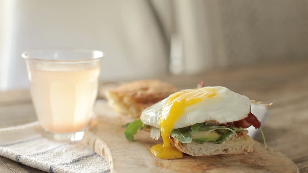 6. Spread spicy sauce, top with avocado (mashed), cheese, arugula, bacon and 1 egg