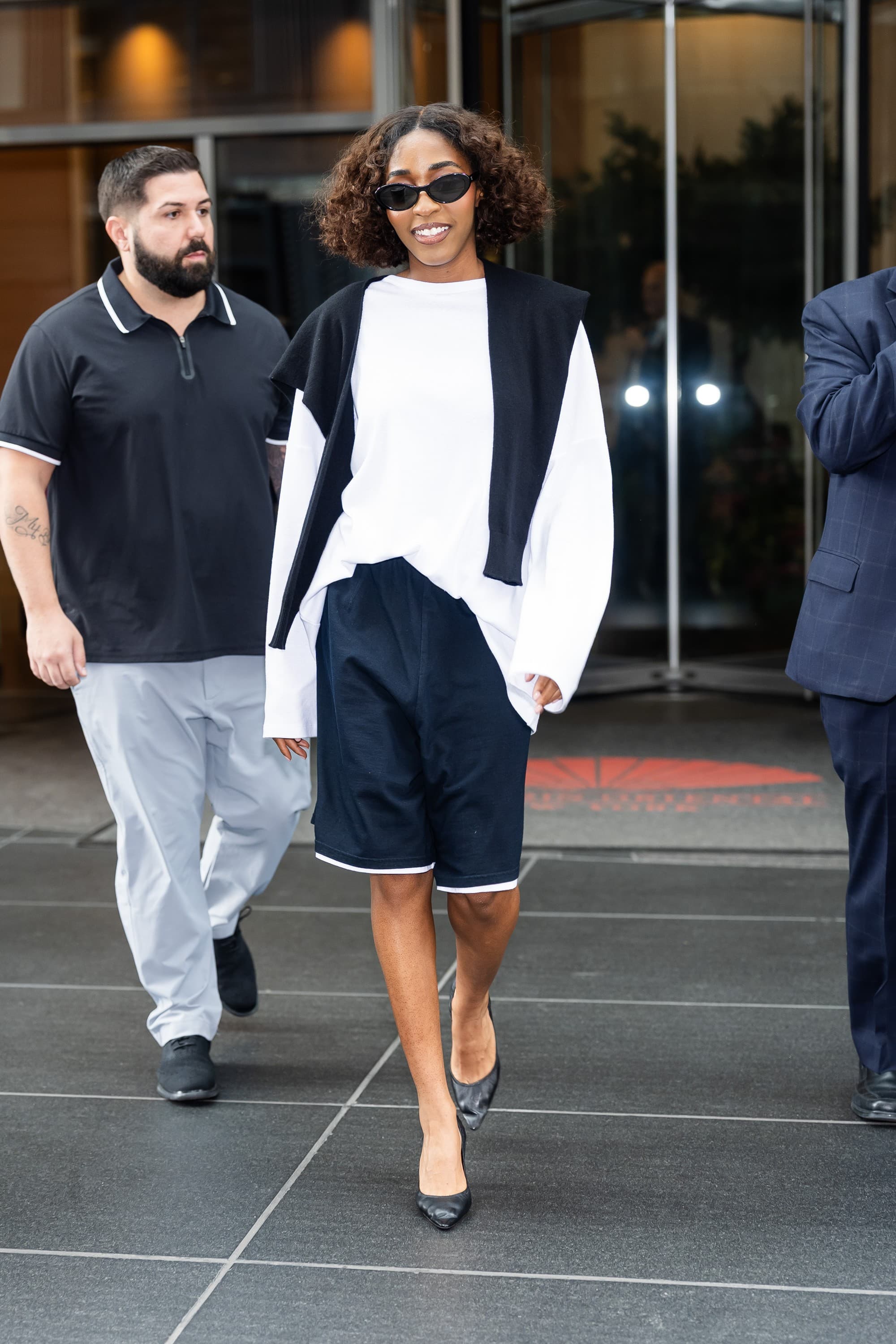 On a day out in Midtown Manhattan while wearing The Row from head to toe, Ayo Edebiri gave "sporty chic" a whole new meaning and let us know that she, and stylist Danielle Goldberg, are very much skilled in the art of mixing aesthetics. As the latest to take on the tried and true Carrie Bradshaw outfit formula, a perfect balance between sporty and feminine, Edebiri makes a strong case for why we all might need a pair of baggy basketball shorts in our wardrobes: they're incredibly versatile.