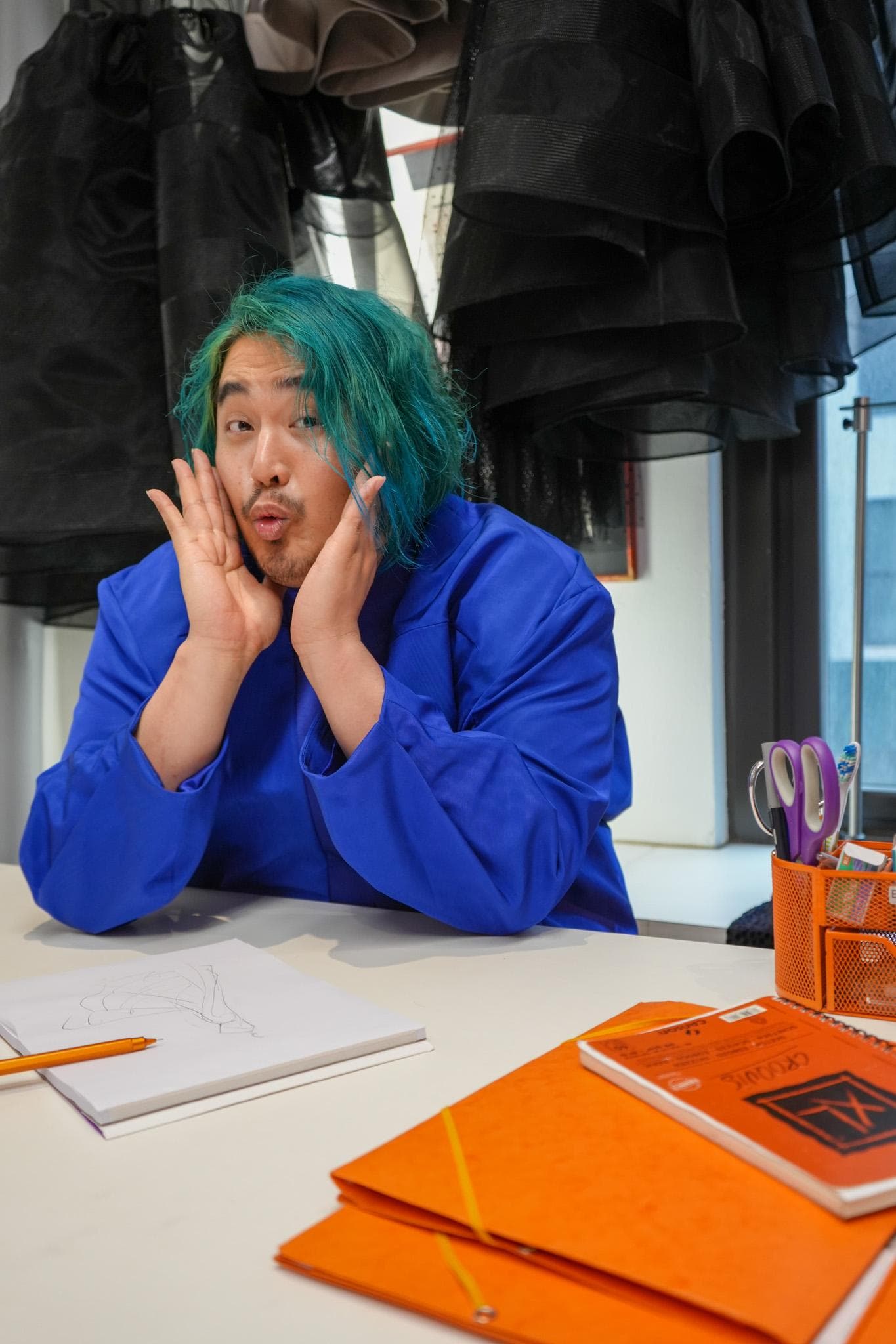 Now, the fashion savant thinks very little of what he wants to wear when it comes to design. He sits before me in his uniform: a v-neck, pants, and a bomber-esque jacket—the latter is the only thing he designs for himself. He almost exclusively wears all black, and prefers shorts until the weather forces him out of them. “I think about clothes all day,” he explains. “It's like chefs. They go home, they don't make themselves an elaborate four-course meal.” But in the sea of black, Mai's teal hair stands out. Inspired by the distinct style of K-pop (another obsession), he changes the hue to match his collections. (It was recently a deeper blue for the debut of Fall '23).