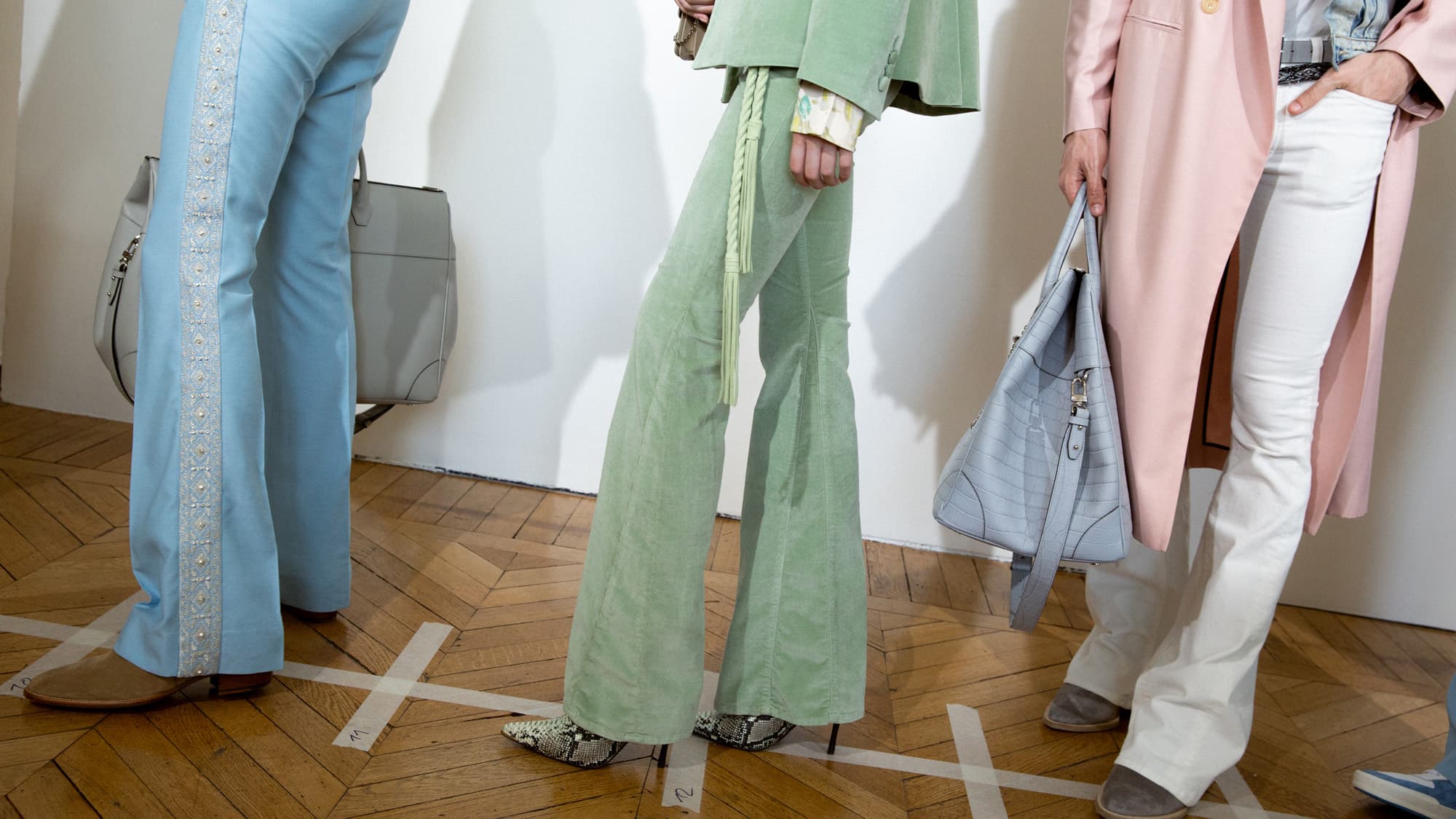 “There are lots of suedes, pastel hues, and chiffon—romantic textiles that have a relaxed feel. We created louche silk knits and crochet techniques as a nod to artisanal craft, and in terms of tailoring, we aimed to create a contemporary silhouette that was slightly looser with a kick flare ankle, acting as an update on an iconic ’70s fit.”