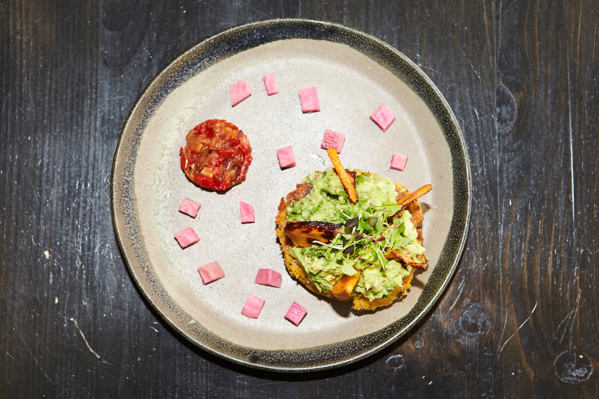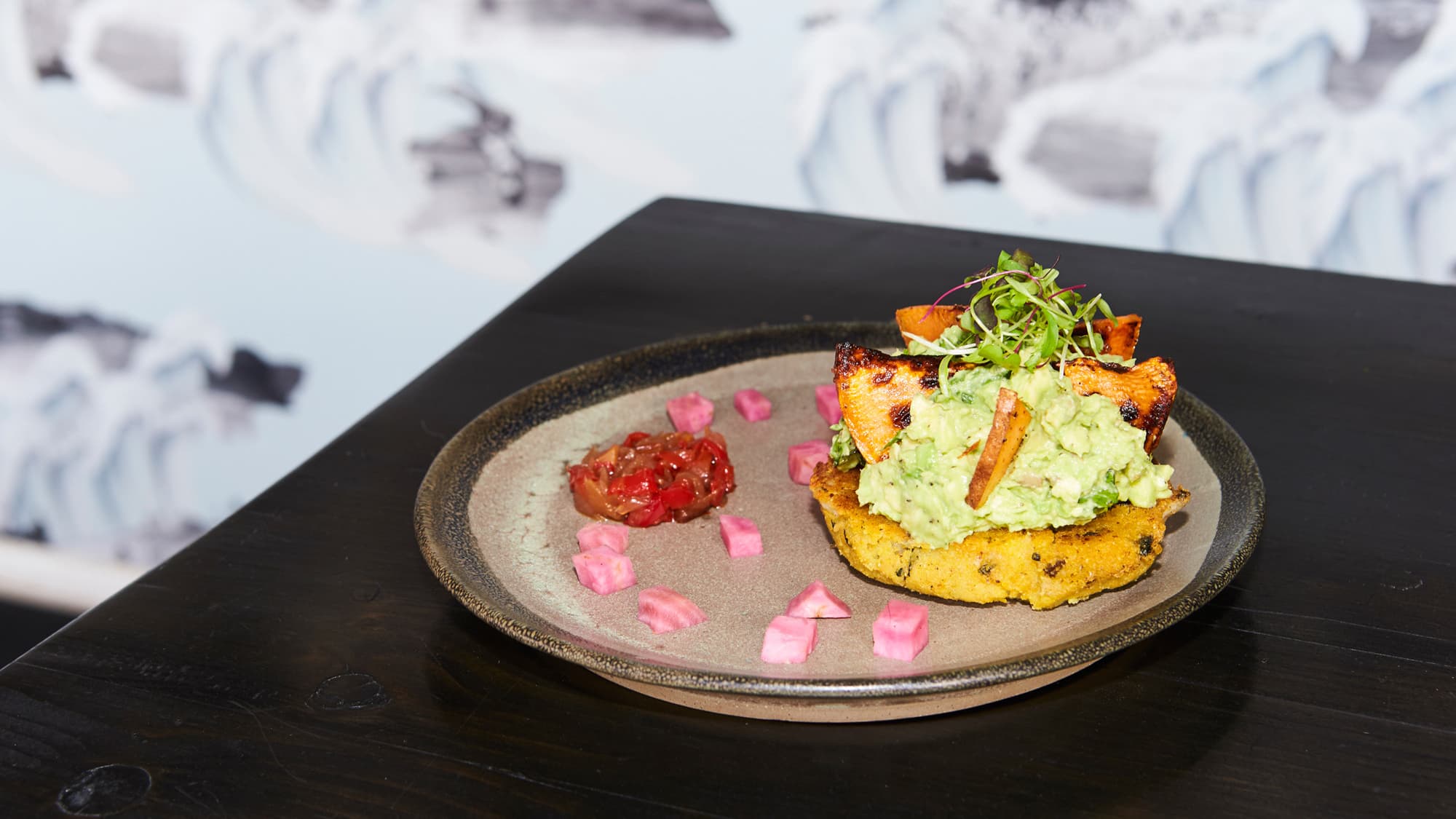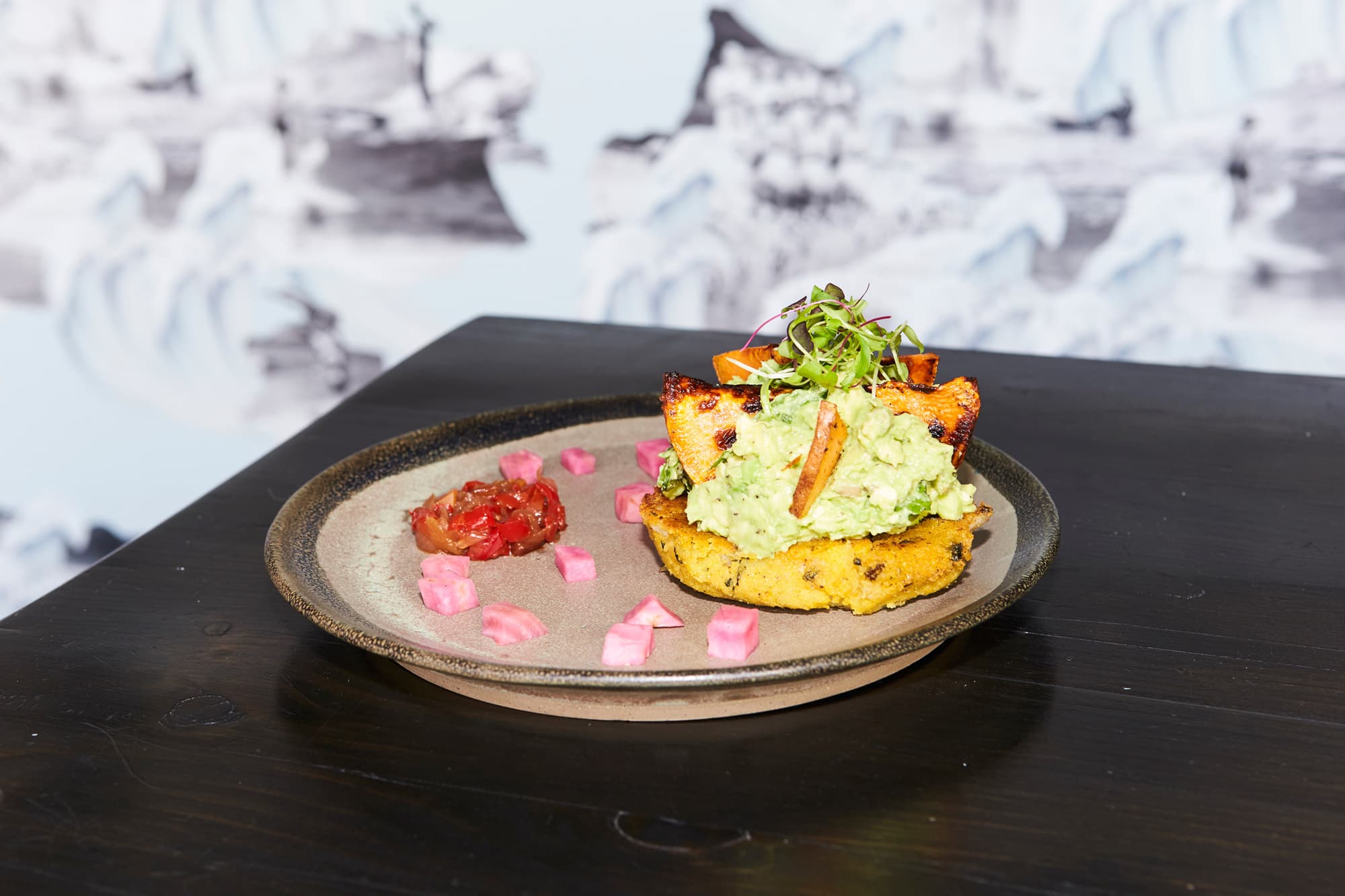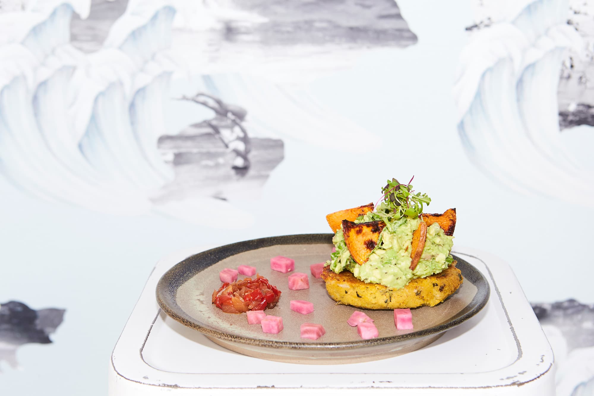 5. Place the polenta fritter opposite the chili jam, and pile the avocado smash on top. Garnish with sweet potato and microgreens.