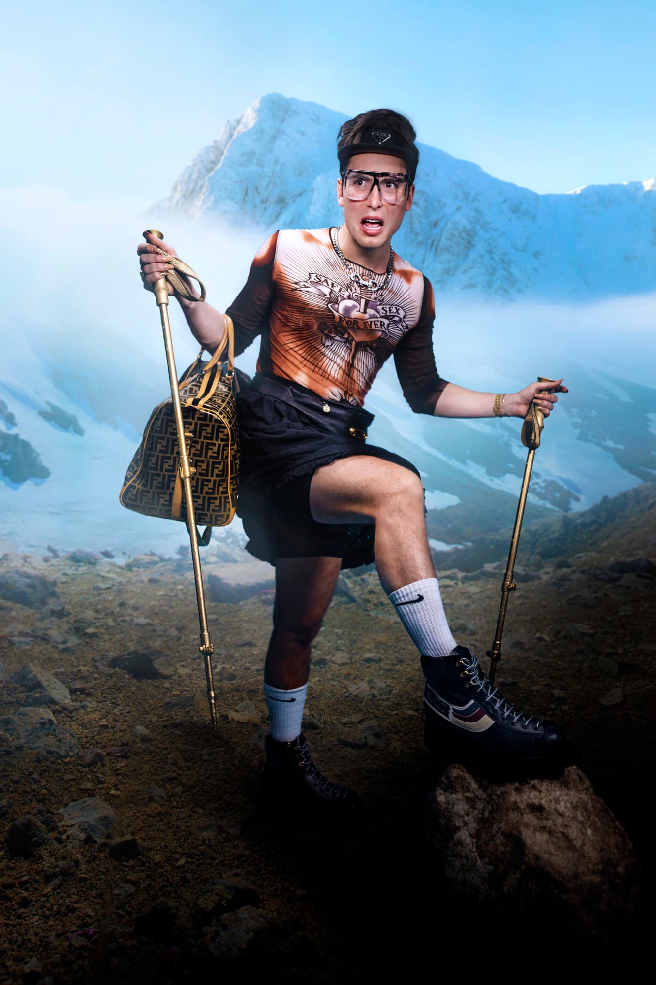 boys, Kardashian k-aricatures in perfect contour, and an adult Annie who’s become a little too adjusted to her “hard-knock life” (only found on the backstreets of queer mecca: West Hollywood). It comes as no surprise the expertly executed clips saw Skinner ascend into another stratosphere. The 26-year-old has become something of a stand-up sensation, touring the country with a show that blends live performance with pre-recorded sketches and visual cues. He does it all, of course, wearing fashion favorite Jacquemus.