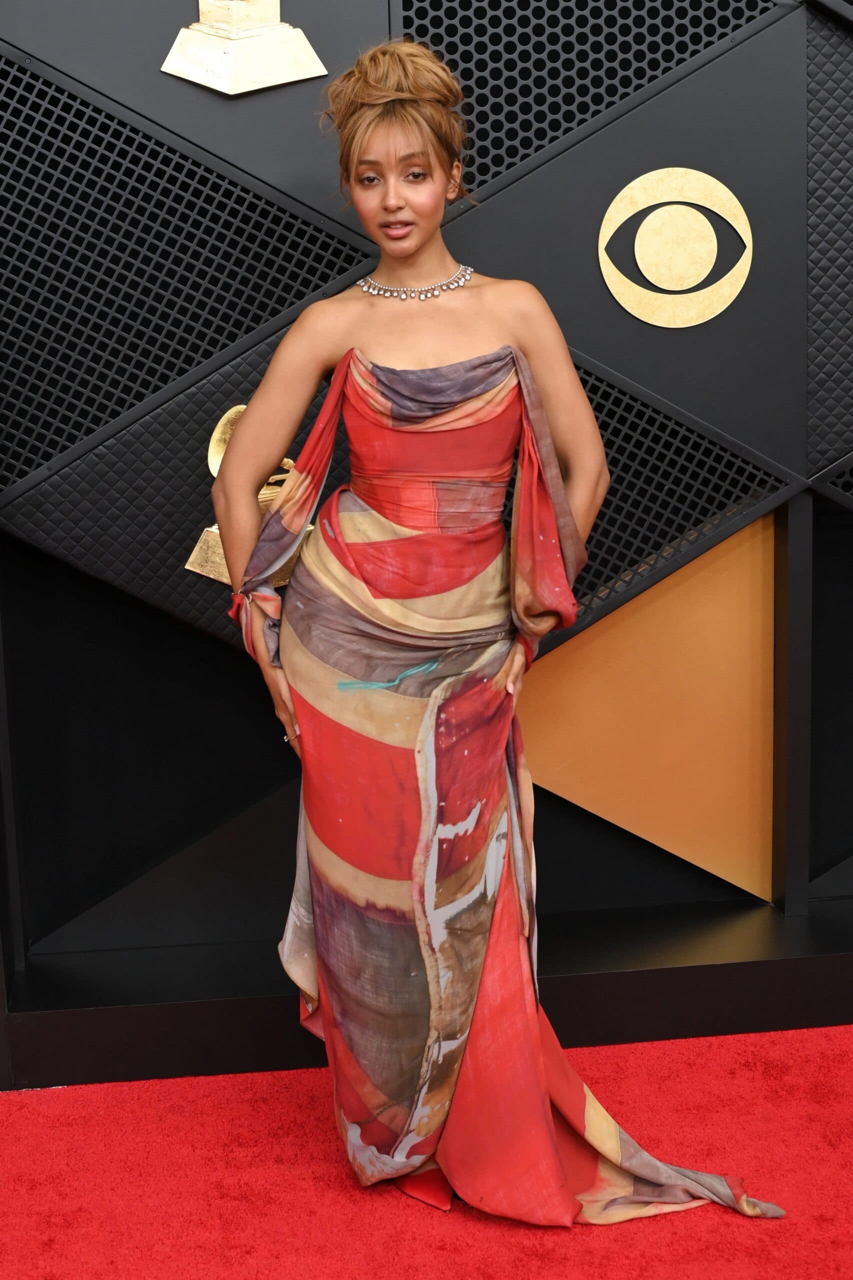 David Fisher/ShutterstockPaired with an updo and red lip, Sabrina Carpenter arrived at the Grammys in a tiered crystal embellished gown with tiered cap sleeves, a custom Valentino look.