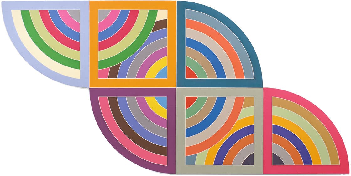 Frank Stella, Harran II, 1967. Polymer and fluorescent polymer paint on canvas, 120 x 240 in (308.4 x 609.6 cm). Solomon R. Guggenheim Museum, New York Gift, Mr. Irving Blum, 1982. © 2016 Frank Stella / Artists Rights Society (ARS), New York, Studio at 84 Walker Street, New York, 1967. Photo by Arnold Newman. © Arnold Newman / Getty Images