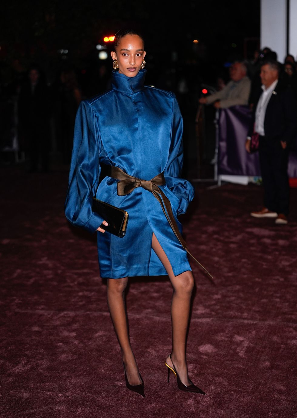 For the WSJ Innovator Awards, Mona Tougaard pulled a look from Saint Laurent's Fall/Winter 2025 collection. The look featured a silky blue dress and coat hybrid, a black bow belt, black heels, and gold jewelry.