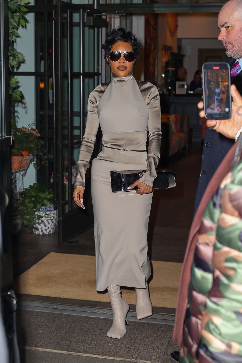 For her appearance on the "Tonight Show Starring Jimmy Fallon," Teyana Taylor pulled a monochrome look from Mugler's Spring 2026 Ready-To-Wear collection: a gray and gunmetal skirt and top set with coordinating boots.