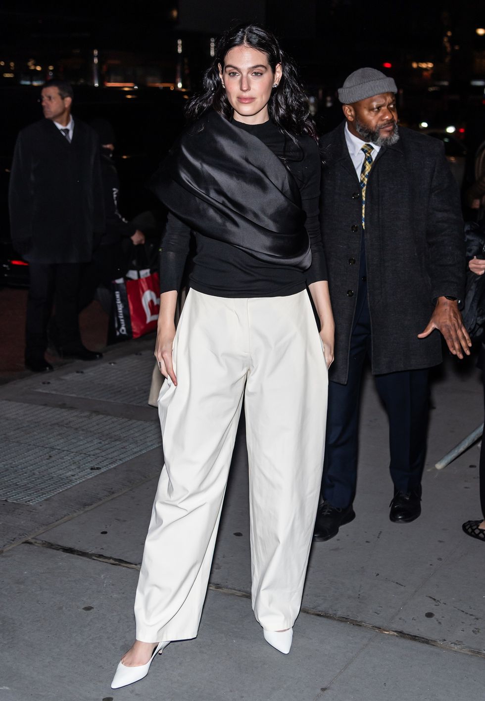 For the National Board of Review Annual Awards Gala in New York City, Eva Victor went for an effortlessly chic look: a black layered mesh and silky draped top, off-white trousers, and simple white pumps.