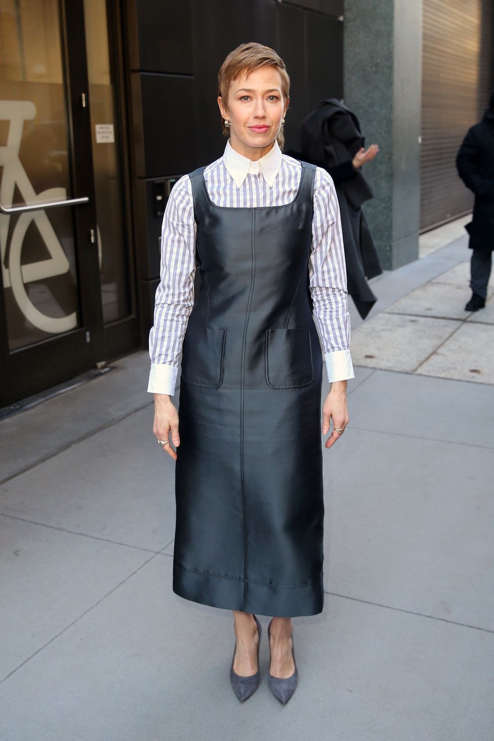 Outside of ABC studios in New York City, Carrie Coon posed in a shiny shift dress with pockets overtop a gray blue and white striped top, buttoned all the way to the top.