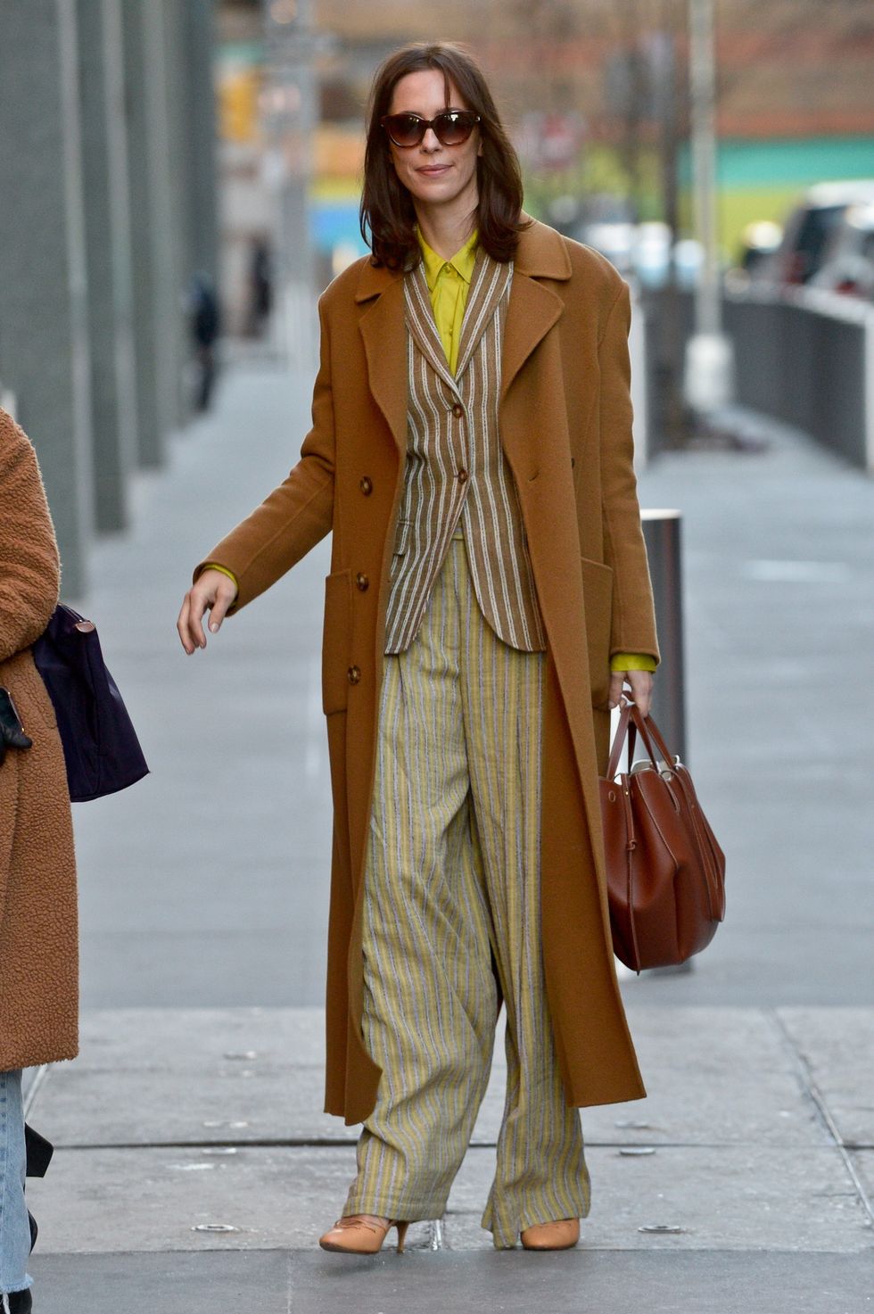 For an appearance on "Good Morning America," Rebecca Hall wore an Ulla Johnson suit from the Spring 2026 collection. The look featured a mix stripes in both spring tones (yellow in particular) and neutrals, adding a brightness to the dull energy of winter.