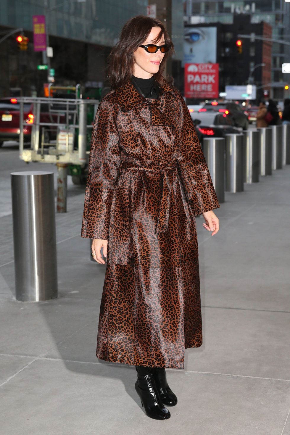 While out and about in New York City promoting "The Beauty," Rebecca Hall was spotted in leopard print trench coat by Nour Hammour.