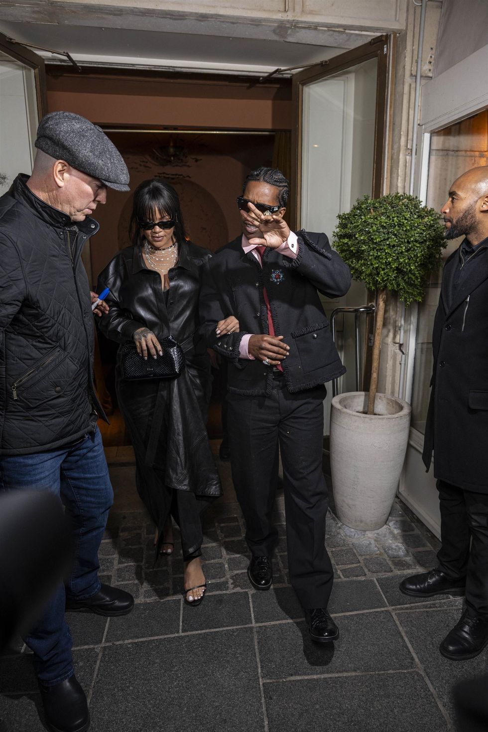 In Paris, Rihanna and A$AP Rocky emerged from their hotel in coordinated black outfits. Rihanna wore pieces from Sarah Burton's Spring 2026 Givenchy show: a full leather look consisting of a button down top and maxi skirt. A$AP Rocky wore a full Chanel look: a structured jacket, tailored pants, and deep red tie for a little pop of color.