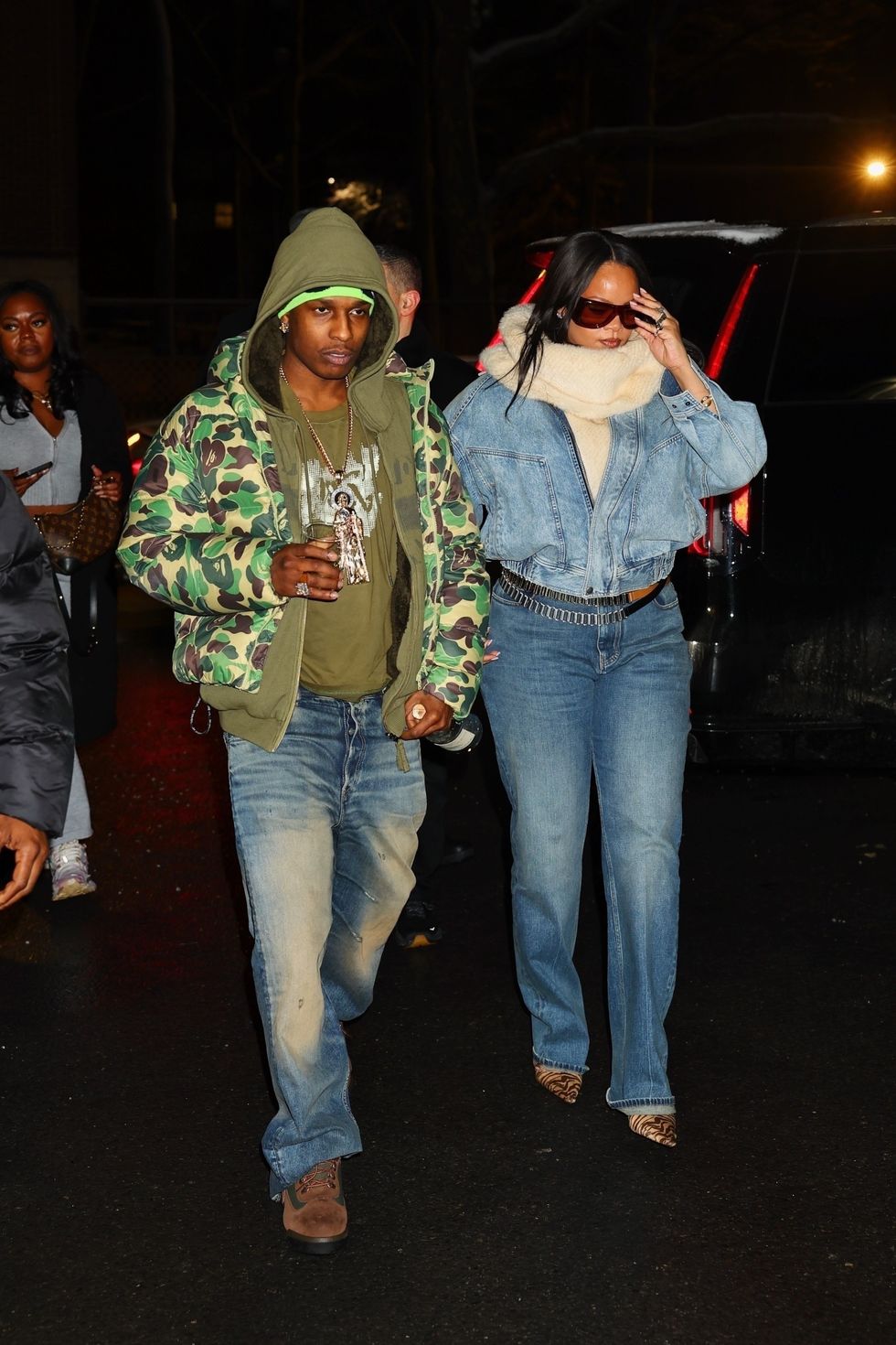 In New York City, Rihanna put her own spin on the Canadian tuxedo and accessorized with textured animal printed pumps, layered belts, and a statement scarf. Meanwhile, A$AP Rocky wore camo puffer jacket by Bape over an army green zip up hoodie.