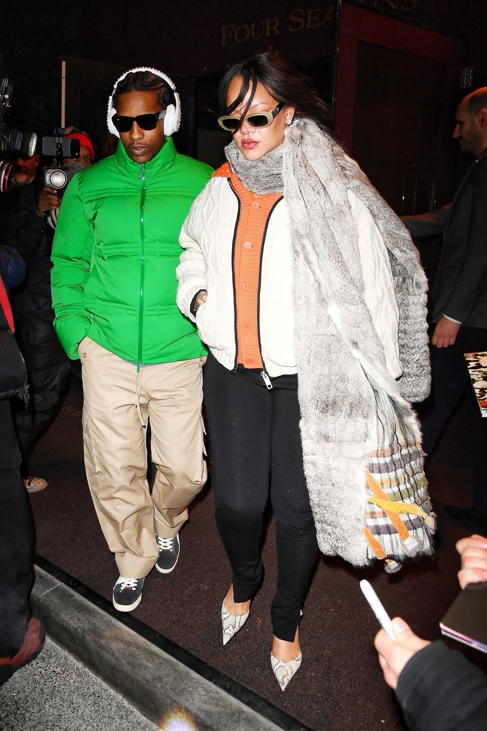 In New York City, Rihanna and A$AP Rocky combatted the winter weather in style. Rihanna wore a cable knit bomber style cardigan from Jonathan Anderson's Dior menswear collection and A$AP Rocky wore a lime green puffer from his collaboration with Moncler.