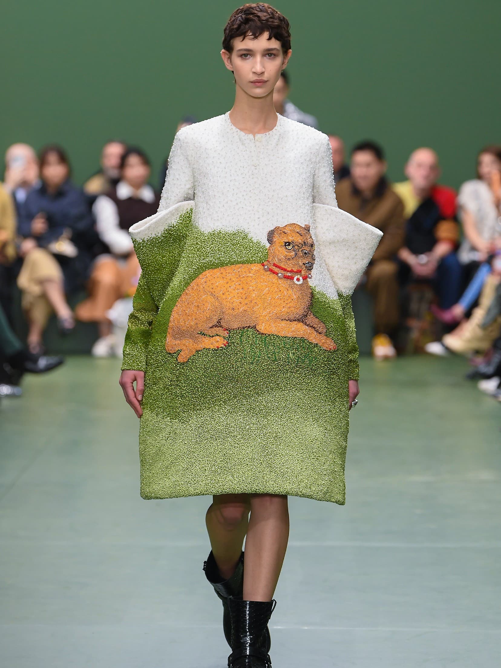 WWD / Getty ImagesAfter Anderson learned that Jackie Kennedy Onassis collected Albert York paintings, the Loewe Fall/Winter 2024 collection was born. The designer played on the notion of class, wealth, and the significance that high society bestows on artifact, producing unforgettable pieces on the runway, like the architectural, dog-printed A-line dress meant to parallel the mosaic rings of the elite, which often featured their pets.