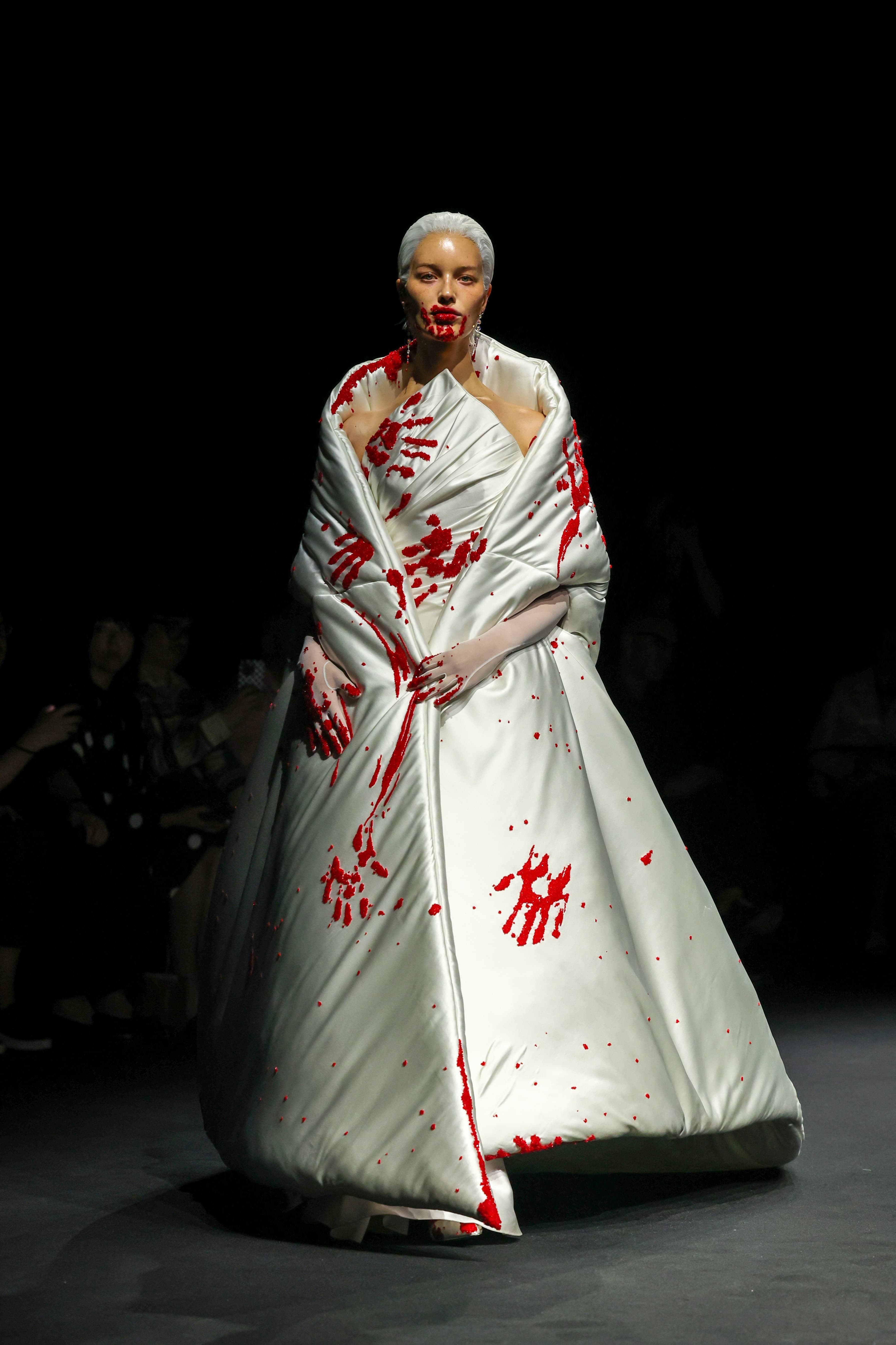 Getty ImagesRobery Wun's Fall 2026 Haute Couture collection was nothing short of haunting, and his opening (and closing) look demonstrated the sentiment best. A satin ivory gown with a duvet-like padded shawl is beaded with blood-red spatters and hand prints.