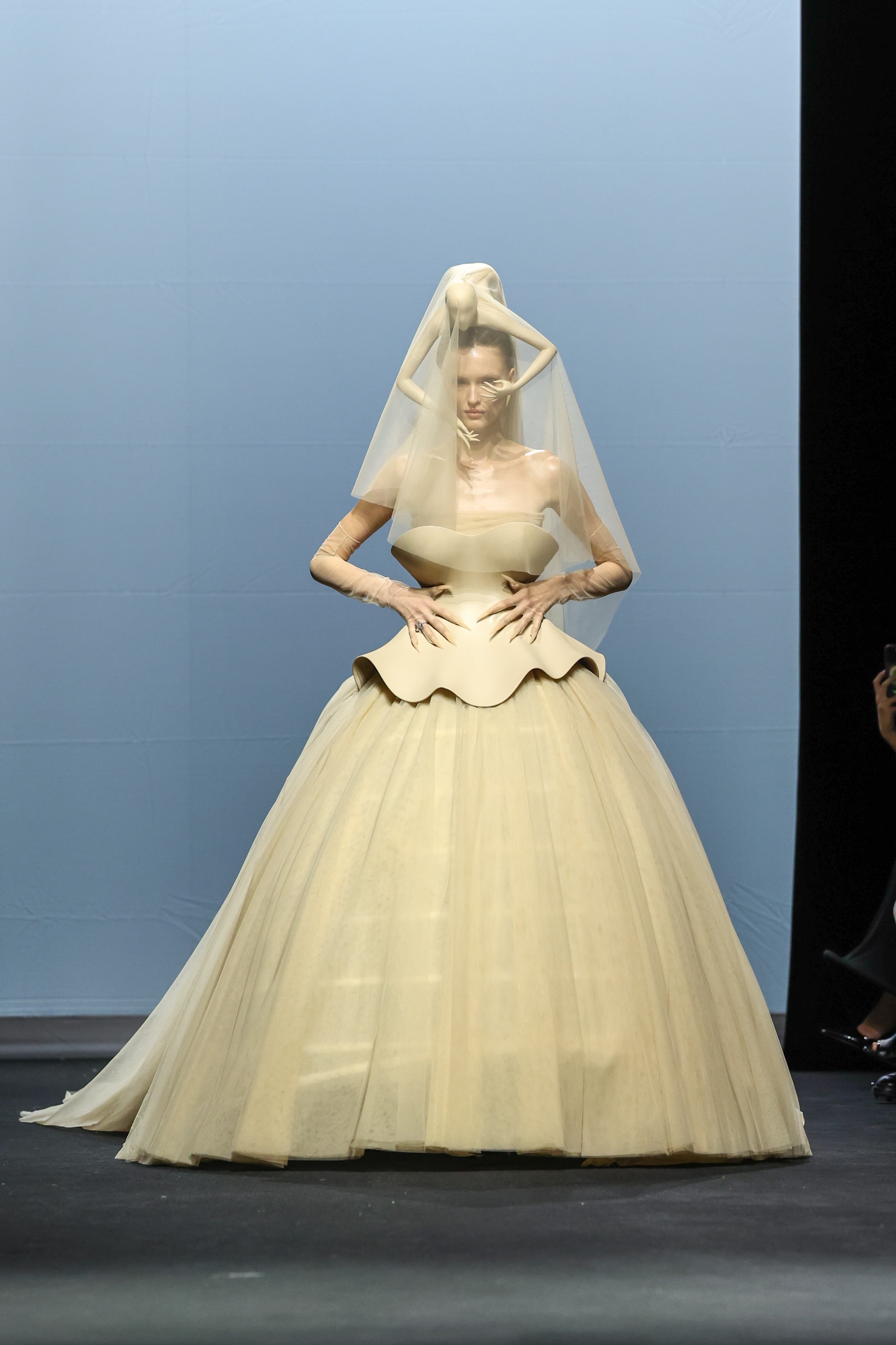 Getty ImagesSimilarly I loved Wun's closing bridal look. The structured corset, tulle, and visible crinoline were all structurally perfect, but the elephant in the room was the small figurine perched on top of the bride's head carrying the veil. Was it a metaphor for the weight of expectation from a designer who is constantly bucking against it?