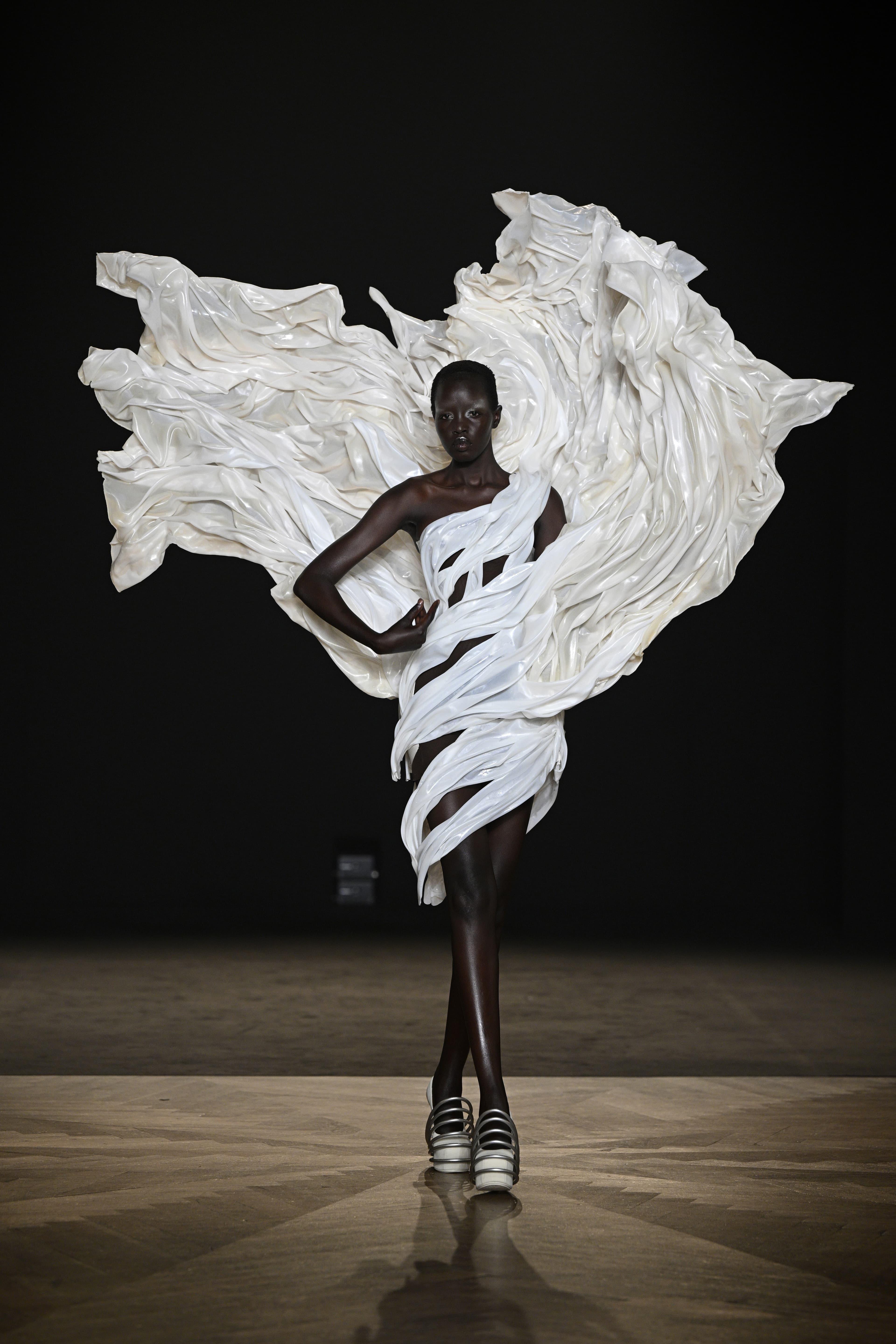 Getty ImagesThis resin-coated silk dress at Iris Van Herpen defied gravity and appeared as though it was plunged into water, the current pulling the dress away and wrapping around her torso. True couture.