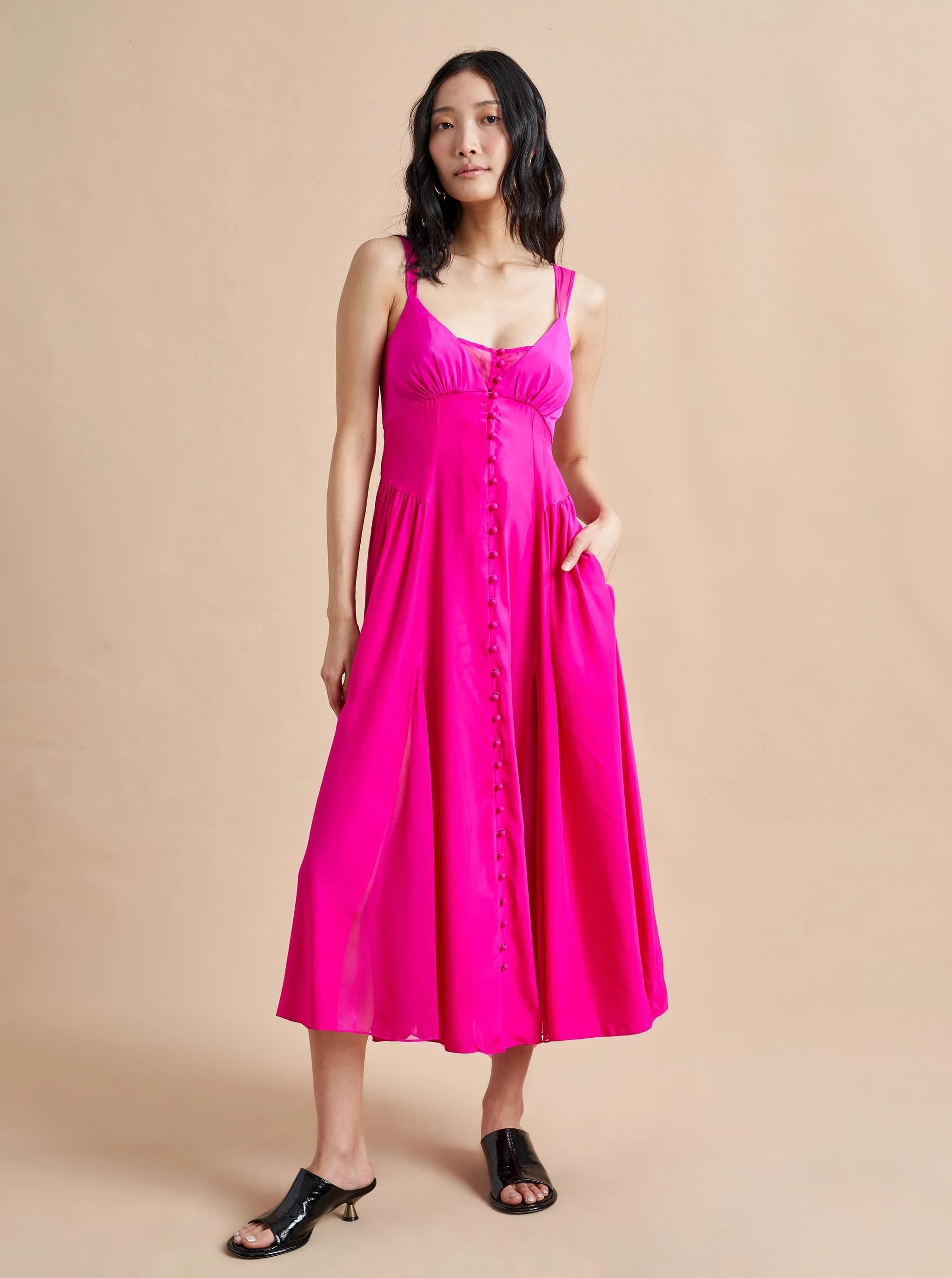 If you’re intrigued by Barbiecore but still a tad hesitant, look no further! With its gorgeous fuchsia color and sheer flowy details, this makes for the perfect summer dress! Pair with a cute kitten heel or—dare I say—cowboy boots?