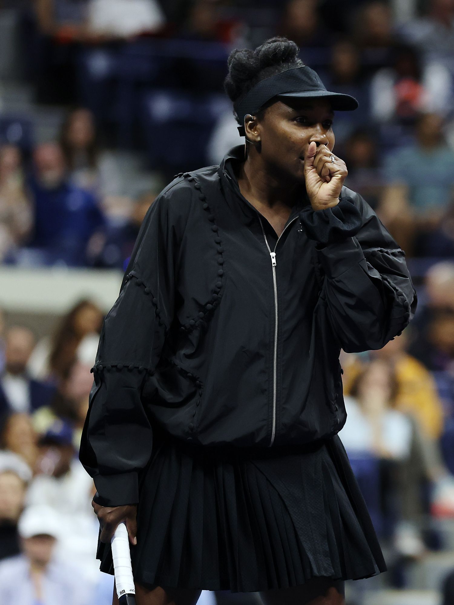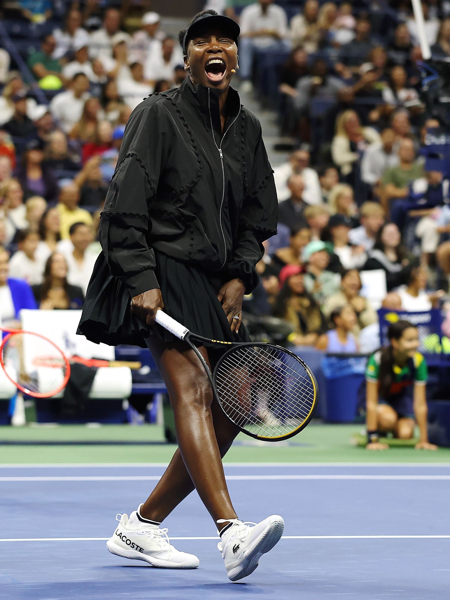For the Stars of the Open exhibition match on August 21st, Venus Williams showed out in a custom Luar set. The all black look featured a zip up jacket with stitching and button details and an asymmetric pleated skirt. This moment served as a remind that an all-black look is always a good idea, even when playing tennis in the summer sun.