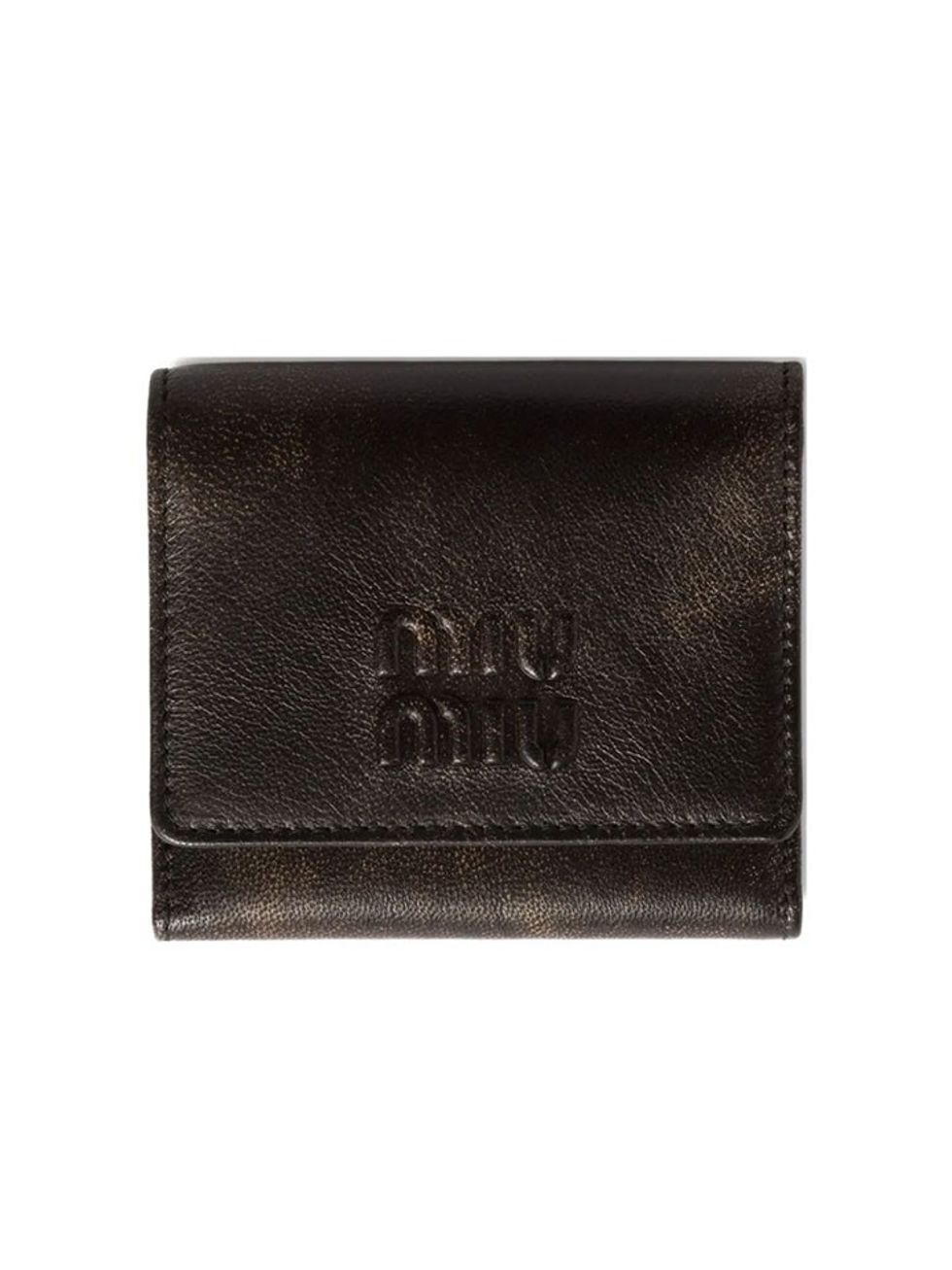 This distressed Miu Miu wallet is perfect for those who throw things around a lot. The interior features a snap closure, zipper coin pocket, and multiple card slots.