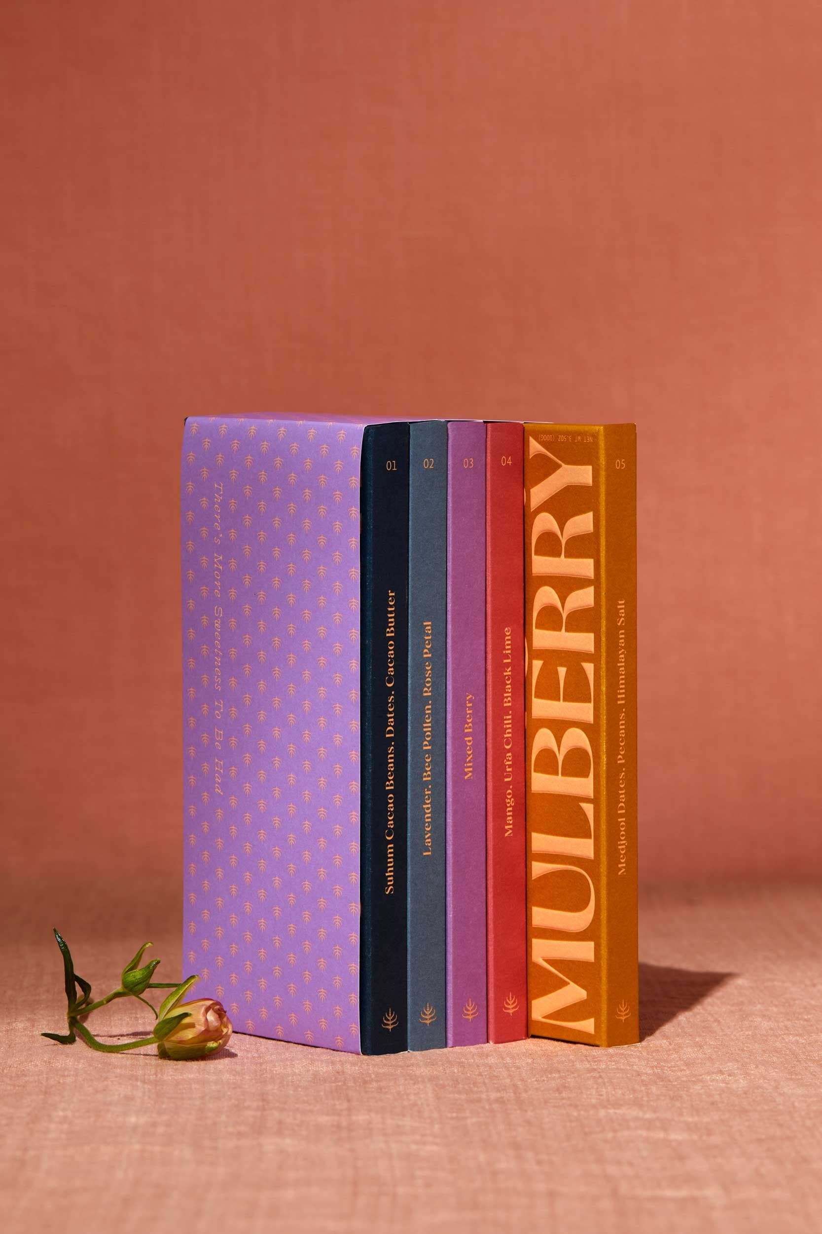 These beautiful chocolate bars are sweetened with dates and boast unique flavors such as pecans, mixed berries, mango, lavender, and rose petals. An ideal choice for a distinctive and thoughtful gift.