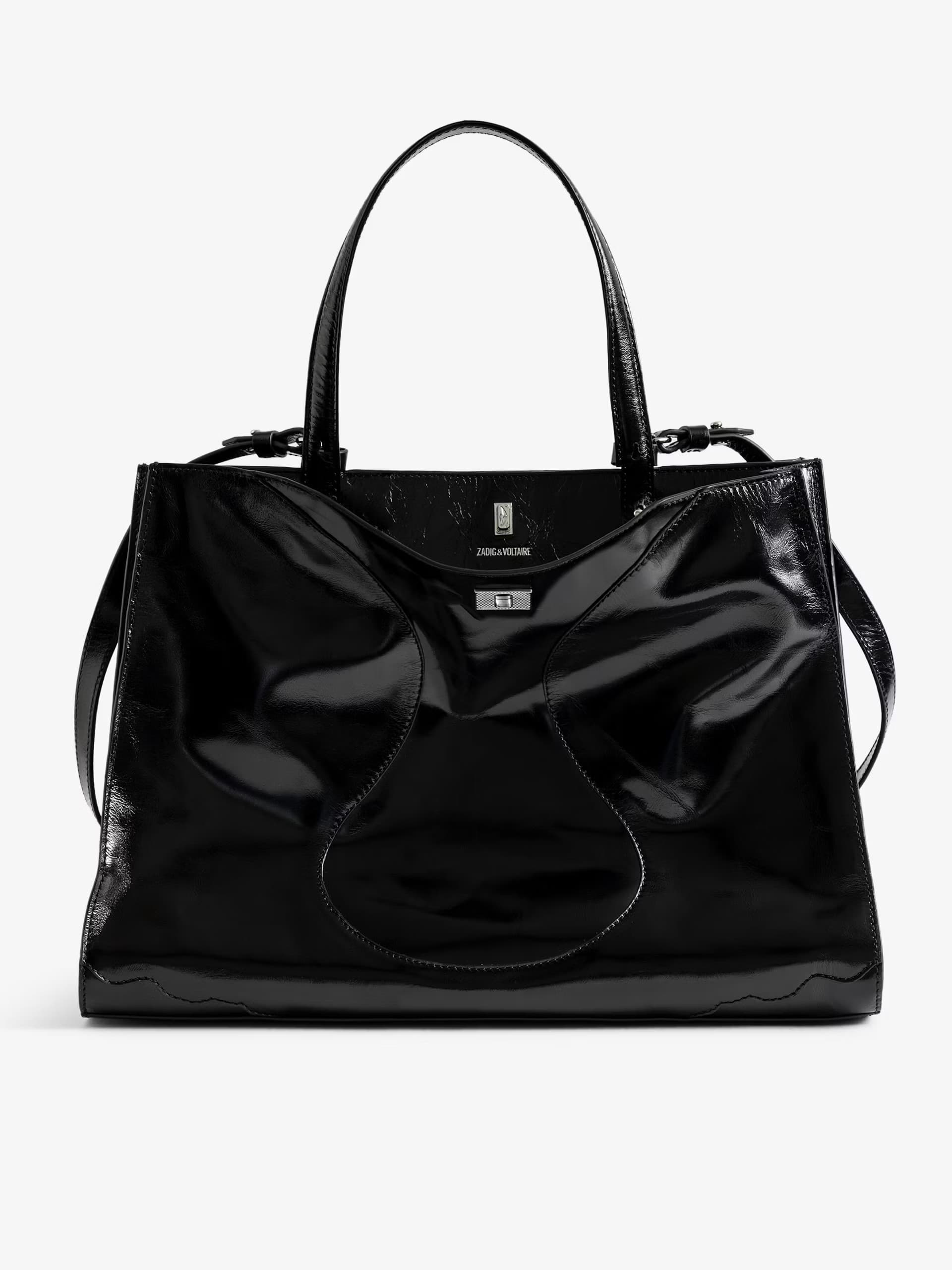 This structured Zadig & Voltaire bag comes in a shiny black patent leather and features both a detachable shoulder strap for convenience and styling options.