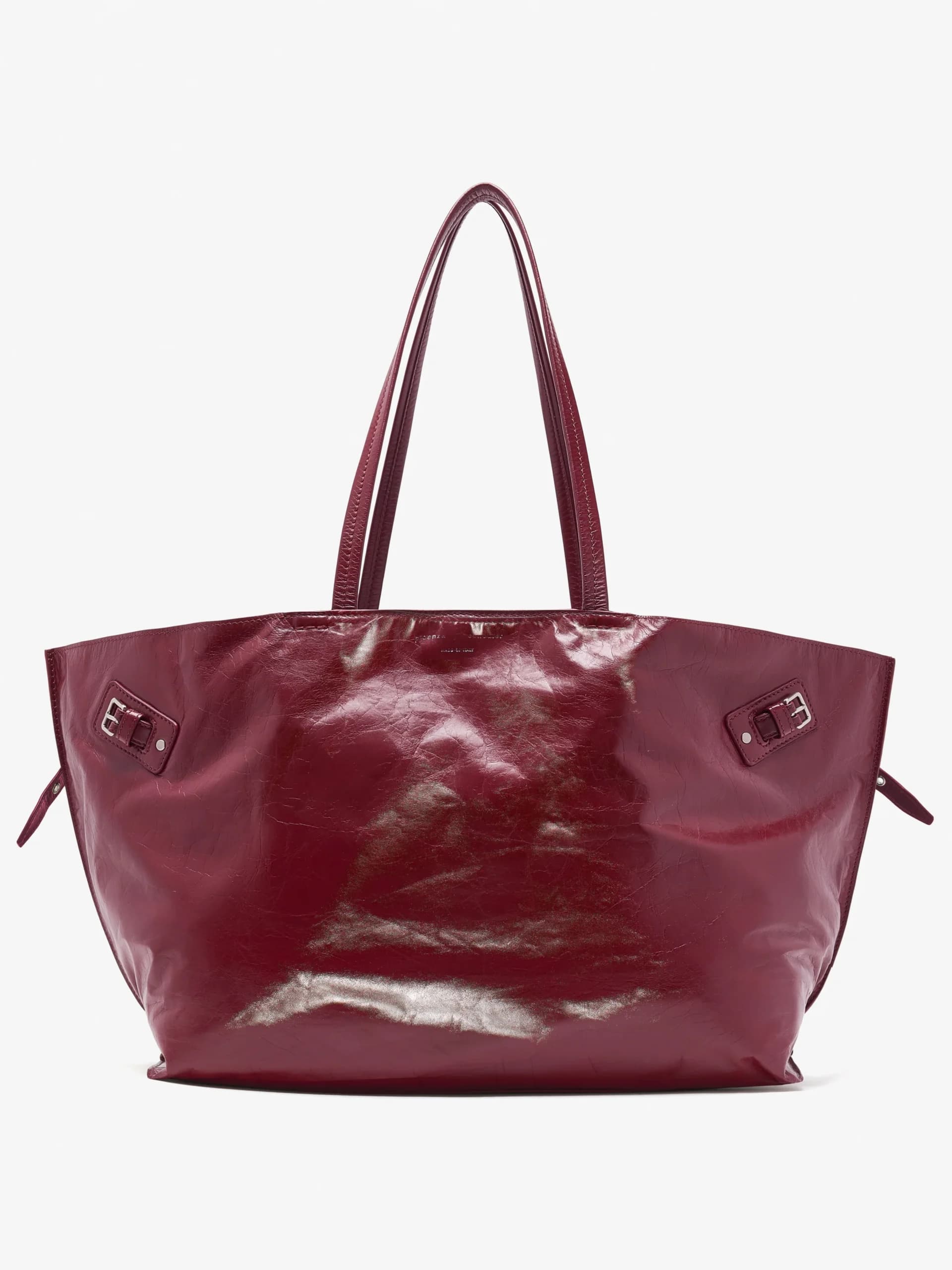 Do add a subtle pop of color to an otherwise neutral outfit, merlot (or any deep red) is always a safe choice. This Proenza Schouler carry all bag is complete with a shiny, crinkly finish.