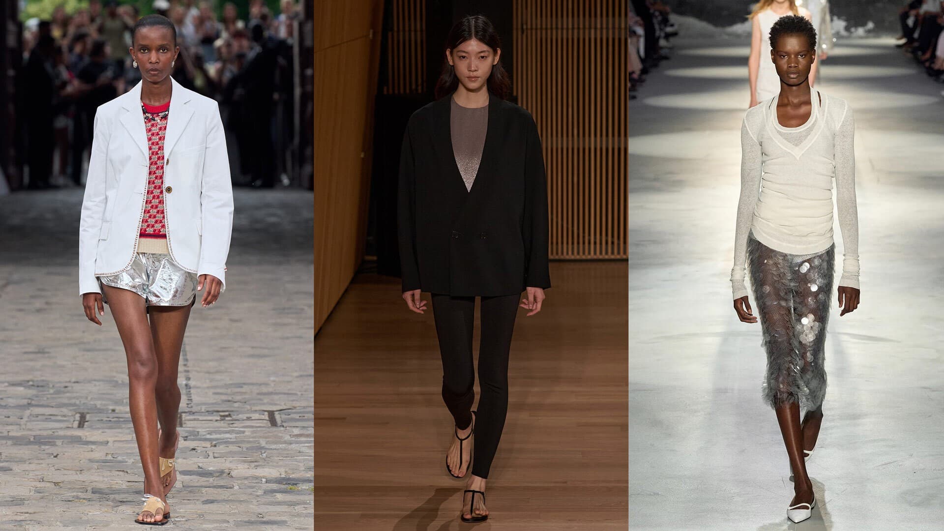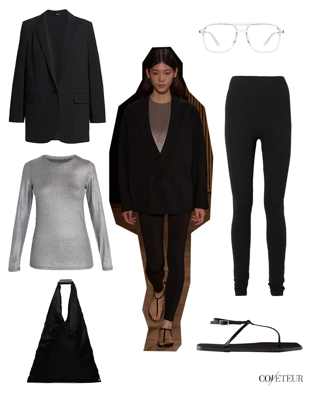 At emerging label Fforme, the designers championed a mostly neutral palette. They did, however, pepper exciting pops throughout like this glimpse of silver glitter via a layered top. Contrast yours with an oversized black blazer and leggings for extra comfort and don’t forget your everyday eyewear. Come fall, swap the thong sandals for a pair of black brogues or derby shoes.