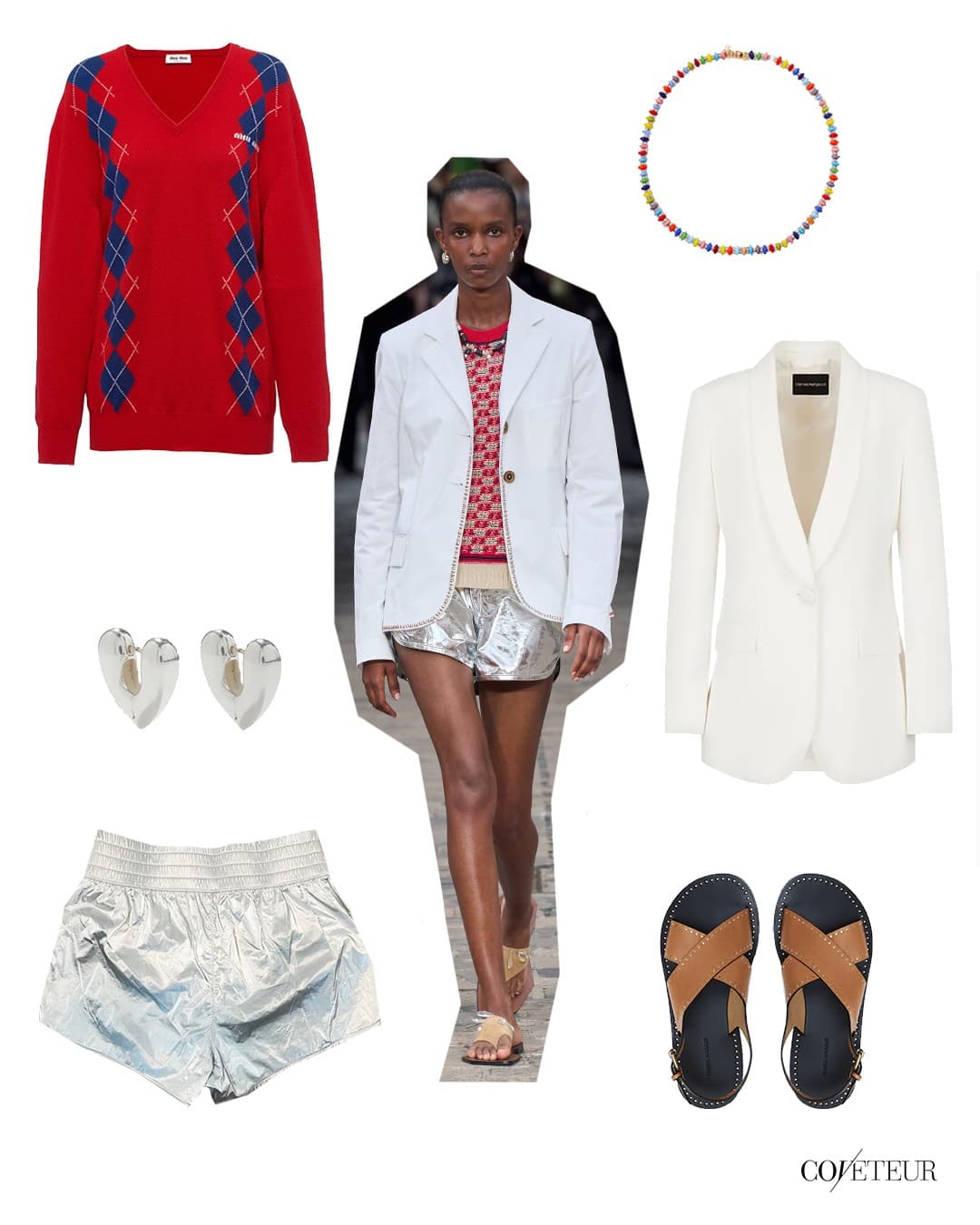 Though Grace Wales Bonner has embraced silver with a recent Adidas collaboration, that’s not the only silhouette she’s entertained. Her Spring ‘24 collection featured these lamé shorts in a number of looks. In this particular ensemble, we love how she mixed the metallics with a colorful sweater and neutral blazer.