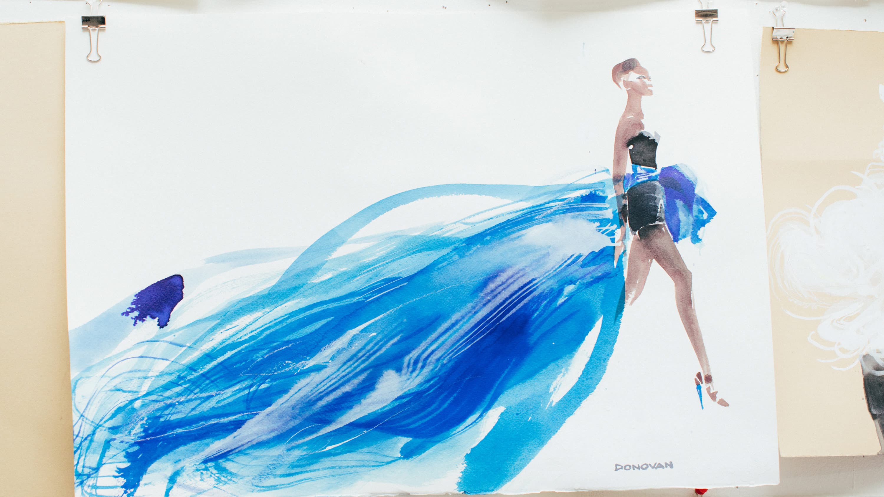 Now Donovan has been the artist-in-residence for the fashion house since 2009. He has since taught illustration at FIT and SVA. His work has been featured in Vogue, Elle, and New York Magazine. Donovan even had his work featured in The MET’s Costume Institute. Sitting in his studio covered from floor to ceiling with his brush strokes, his paper-and-paint visions of dresses and design, Donovan can hardly believe how he got there.