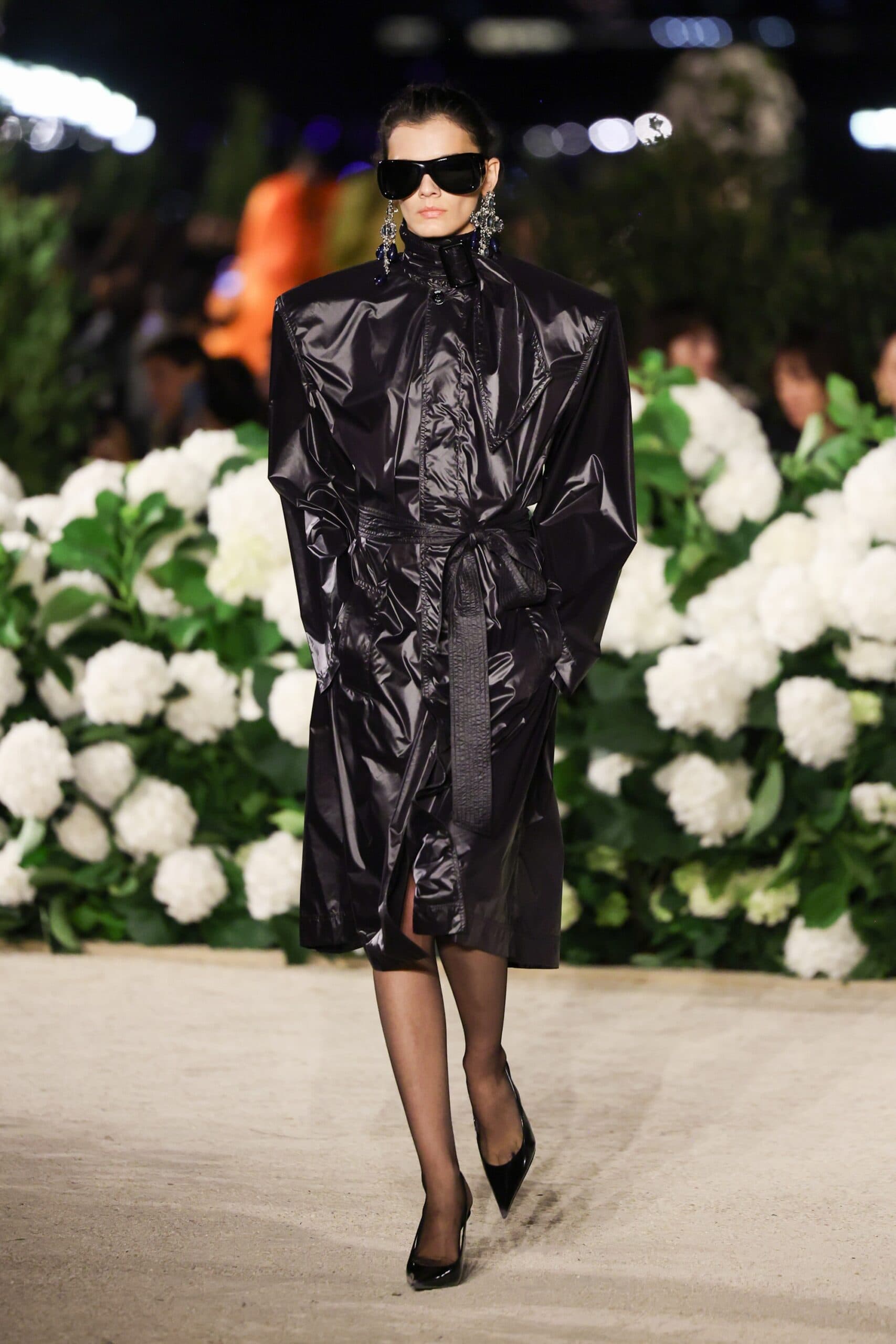Balenciaga FW25 Getty ImagesThis styling technique is no new concept, but on the Fall/Winter 2025 runways and beyond earlier this year, plenty of designers employed the trick in their shows, offering up sumptuous black evening coats with a nothing underneath approach for maximum impact. At Balenciaga's Fall 2025 show (Demna's last RTW collection for the house), a model walked the runway wearing a classic black wool overcoat, accessorized with a simple pendant necklace, sheer black tights, and black pumps. Elsewhere, different textures are worked in to create more dimension in the simple dressing strategy. At Saint Laurent's Spring/Summer 2026 show this October, Anthony Vacarello sent a series of nylon trench coats down the runway. The most evening-adjacent was, of course, a shiny black trench, paired with heavy cross costume earrings, patent stiletto pumps, and dark sunglasses for maximum-impact.