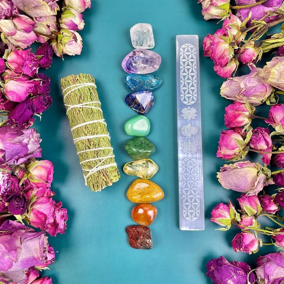Chakra Zulu's mission is to share the power of crystal healing through their unique selection of crystal specimens, jewelry, aromatherapy, candles, herbs, and singing bowls with a curated assortment of crystal sets for chakra healing and each zodiac sign. The 10 Stone Chakra Healing Bundle includes ten crystals correlating to the chakras, a white sage smudging stick, and a cleansing selenite wand.