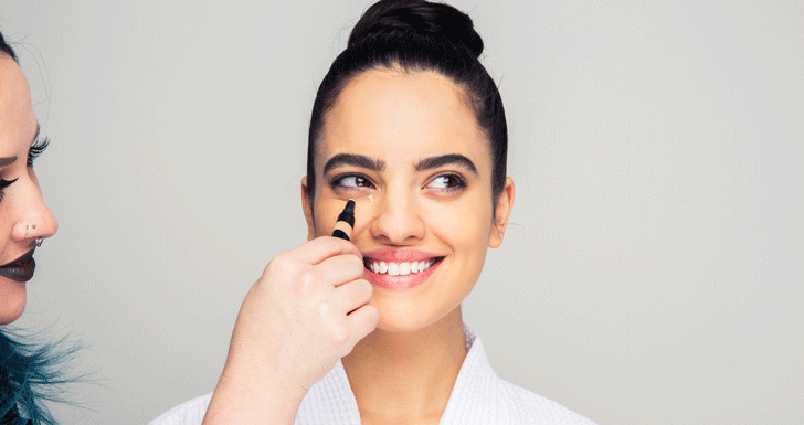 For an instantly flawless complexion, choose from the peach color correcting shades to neutralize dark circles—in the mirror, drop your chin to see exactly where the circles are. Then, use a concealer shade to brighten the inner and outer corners of your eye.