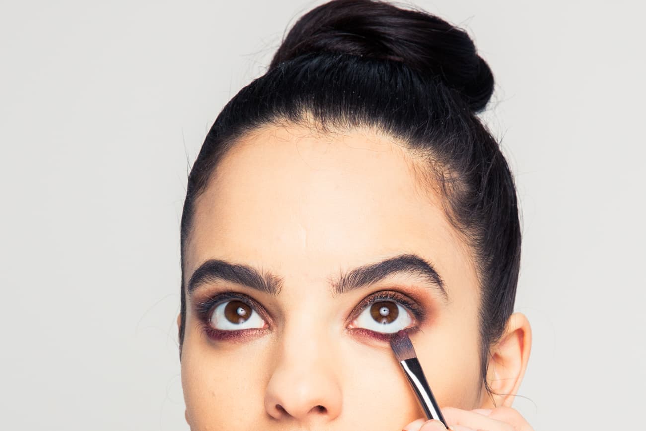 If you want, you can be done now. But to bump up the look, add in a burgundy shade, which works well when you attach it to a neutral base. Burgundy (M-844) looks amazing on blue, brown, green and hazel eyes. Use the same brush as before and press it about three-quarters of the way into the center of the eye on both the top and bottom. Use a fluffy brush to smudge the color.