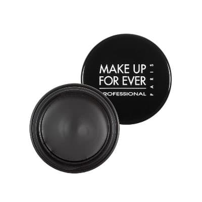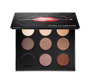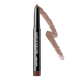 3. “For eyes, use the Aqua Matic eye shadow pencil in S-60, a chocolate brown. Apply a messy, thick eyeliner all over the eye. Blend it out with a flat, firm brush. To incorporate color into the smoky eye, apply the sparkly brown from Artist Palette Volume 1 with the same firm brush, using a tissue to cover your face. Tap the shadow in, using a consistent intensity across the entire eyelid.