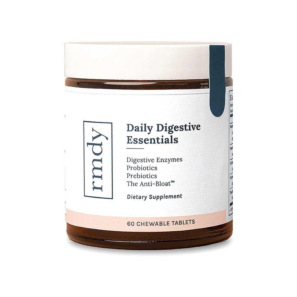 RMDY is a preventative chewable supplement for people who struggle with digestion to take before meals. It blends digestive enzymes, four strains of probiotics, prebiotics, and an herbal blend including ginger, fennel, and peppermint to help prevent bloating.