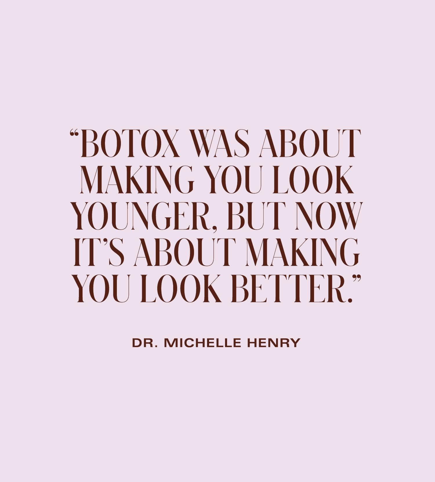 Part of that can be attributed to how doctors have adapted their technique over the years. "Much of what has allowed us to accept Botox as a routine treatment definitely has to do with our perception of the results," says Dr. Sunder. "The Botox of 2021 is much more artful, subtle, and natural-looking compared to the Botox of the 1990s, so it's more palatable to the consumer." Or, as Dr. Shafer so succinctly puts it, "Botox was about making you look younger, but now it's about making you look better."