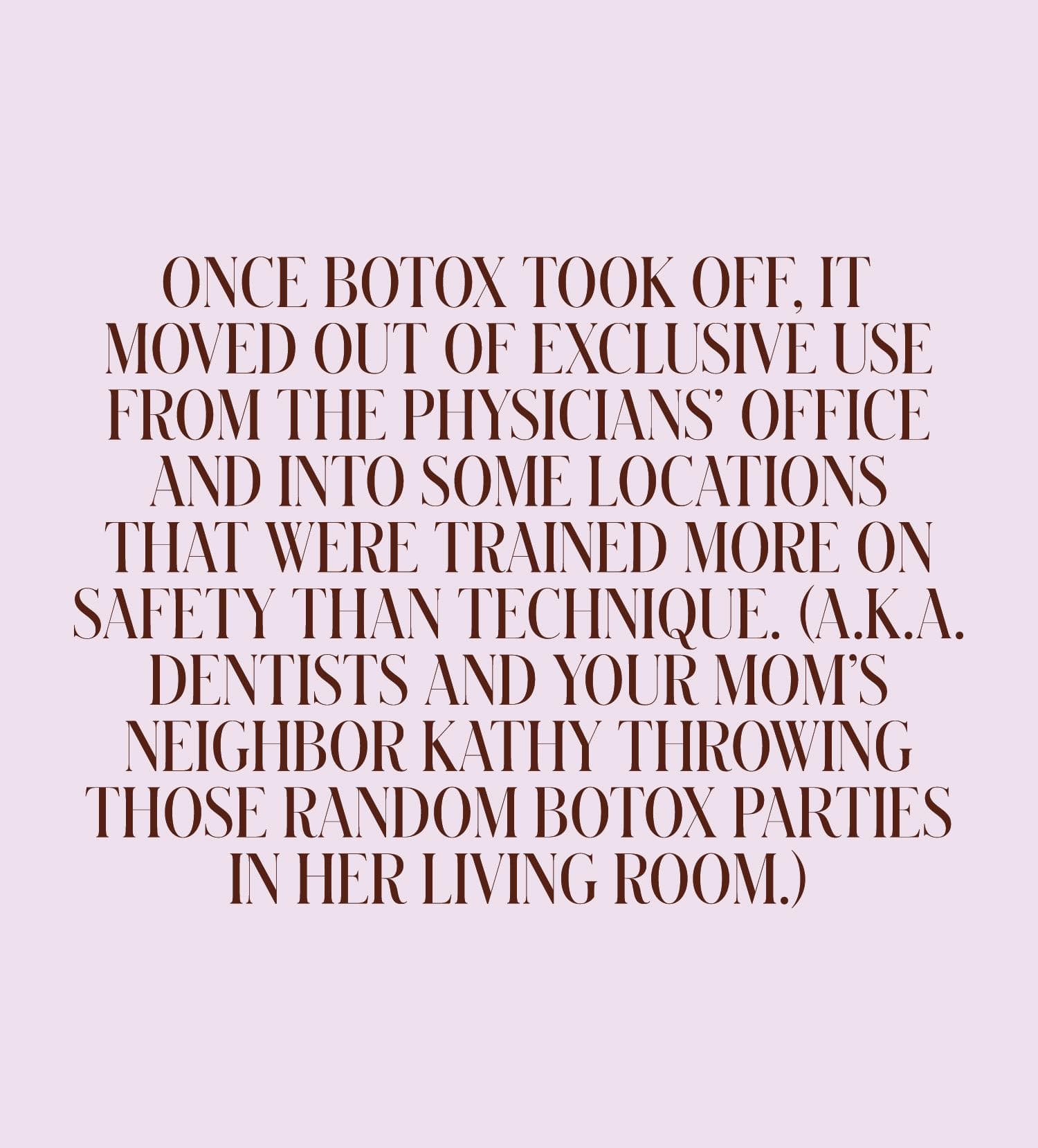 Soon plastic surgeons and dermatologists across the country were offering Botox treatments to patients, many of whom had never gone to see a dermatologist before. The initial hesitation had mostly fallen by the wayside as Botox entered the public discourse, with people being more impressed with its one-shot wrinkle-erasing powers than concerned about its toxic origin story. "It was only physicians doing it initially, and if you trust your doctor and they tell you they have a treatment that they believe is safe and effective [for reducing wrinkles], most people were like, 'Cool, this is awesome. No wrinkles—sign me up!'" says Dr. Day.