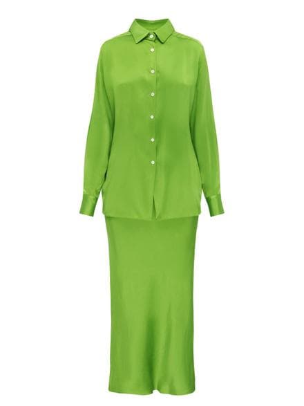 “I wear this dress a lot. It's Christopher Esber. I really like silk. It obviously takes a cue from that Donna Karen Great Expectations moment with Gwyneth Paltrow. I feel like that's one of the greatest, iconic film looks ever. Green is my favorite color; I only know this because my kids are constantly like 'What's your favorite color?' So I've had to settle on green. The silhouette is easy. It's a very pretty day dress, but I think it's really easy to dress it up. The dress is genius. It has a bias cut side zip and then the button-down so you can wear it tucked in totally, or you can wear it so it looks like two pieces. It has a lot of different ways that can be styled.