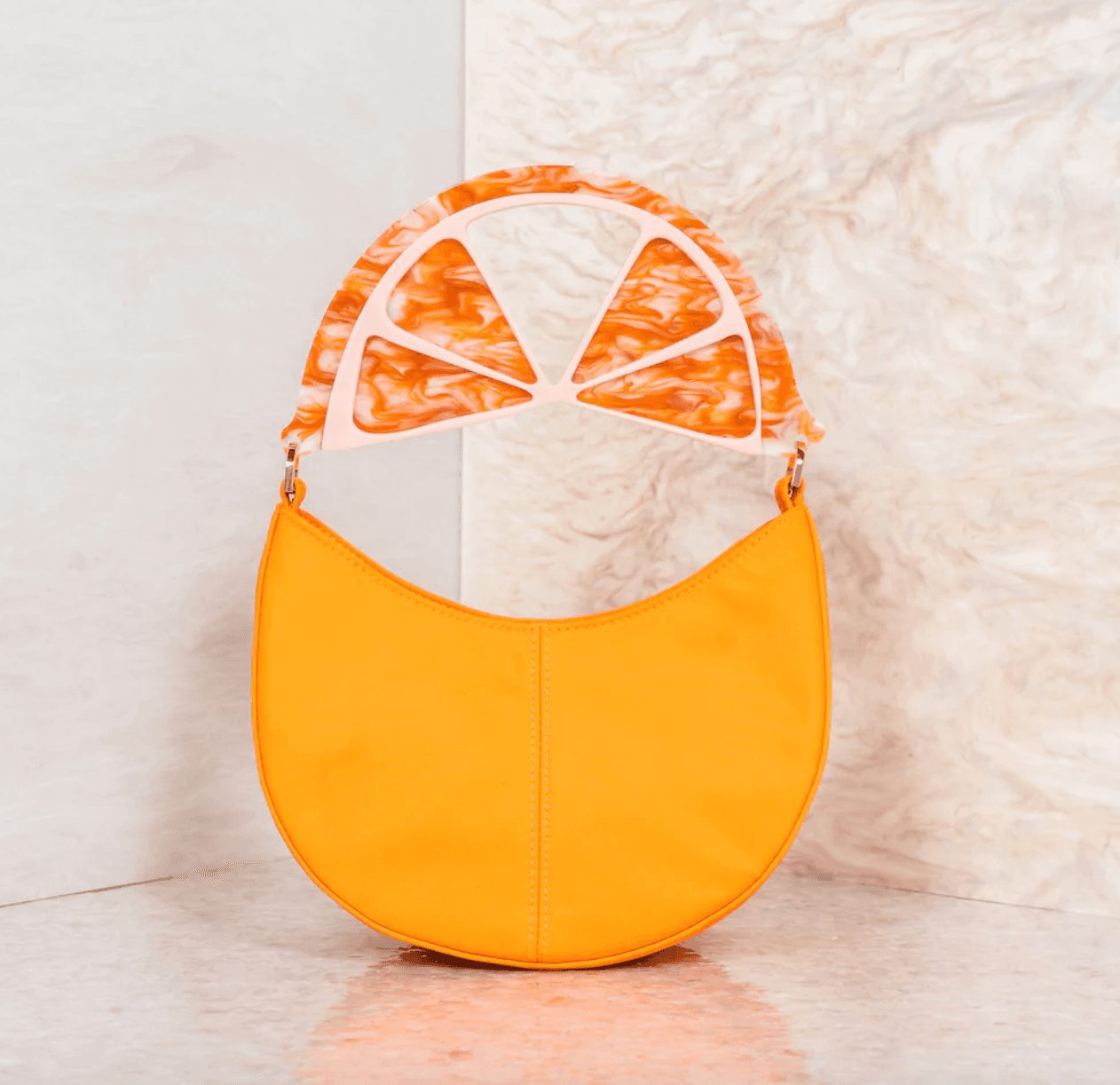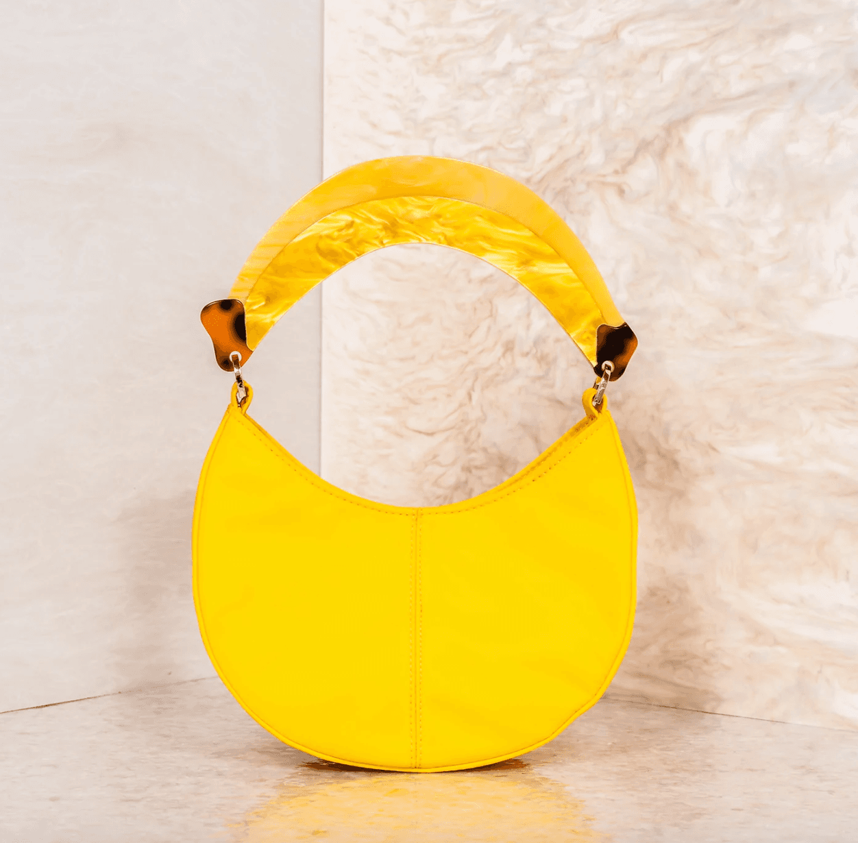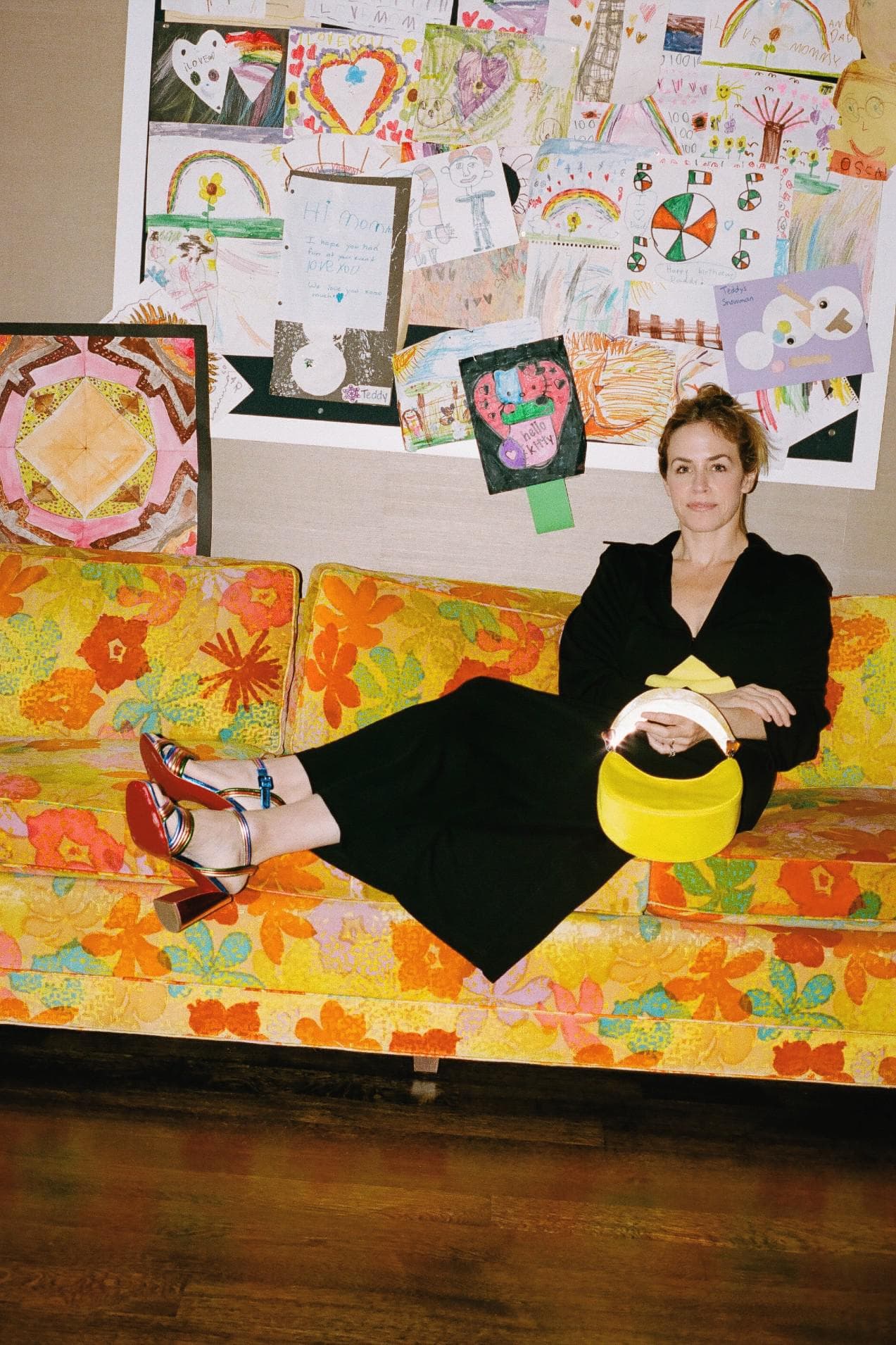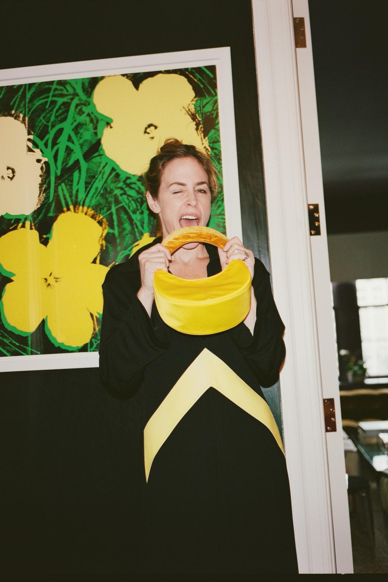 “The black and yellow dress is also old Celine. I like a long-sleeve dress. Those are the only new shoes that I've bought recently. I had Louboutin shoes on with that because they were rainbow and fun and chunky. I was going to Miami and I felt like I needed a Miami shoe. That's our Edie Parker slice bag. It has an acrylic banana handle with a nylon body. I obviously like my handbags to have some sort of conversational element. It's a good way to meet people.”